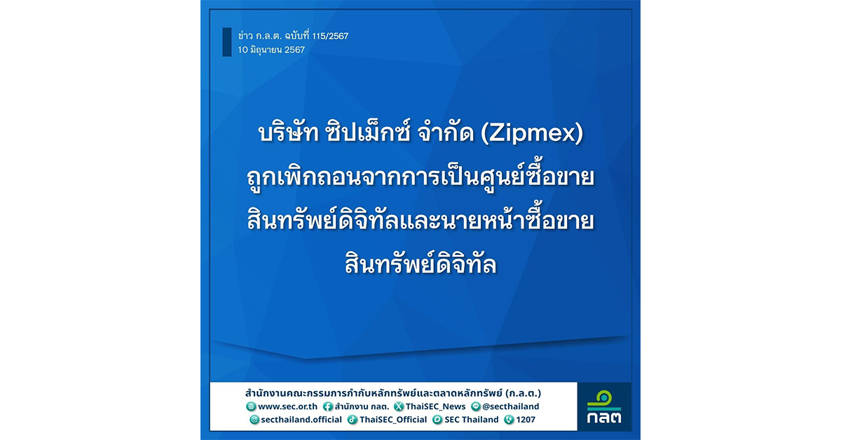 รัฐมนตรีว่าการกระทรวงการคลังโดยข้อเสนอแนะของคณะกรรมการ ก.ล.ต. มีคำสั่งเพิกถอนการอนุญาตประกอบธุรกิจสินทรัพย์ดิจิทัลของบริษัท ซิปเม็กซ์ จำกัด (Zipmex) ตั้งแต่วันที่ 28 พฤษภาคม 2567 เนื่องจากมีฐานะทางการเงินที่อาจก่อให้เกิดความเสียหายแก่ลูกค้าและโครงสร้างการบริหารจัดการและบุคลากรที่ไม่เหมาะสมและเพียงพอที่จะทำให้การประกอบธุรกิจเป็นไปอย่างมีประสิทธิภาพด้วยความรับผิดชอบ ตามหลักเกณฑ์ วิธีการ และเงื่อนไขที่เกี่ยวข้องตามการสั่งการของคณะกรรมการ ก.ล.ต.