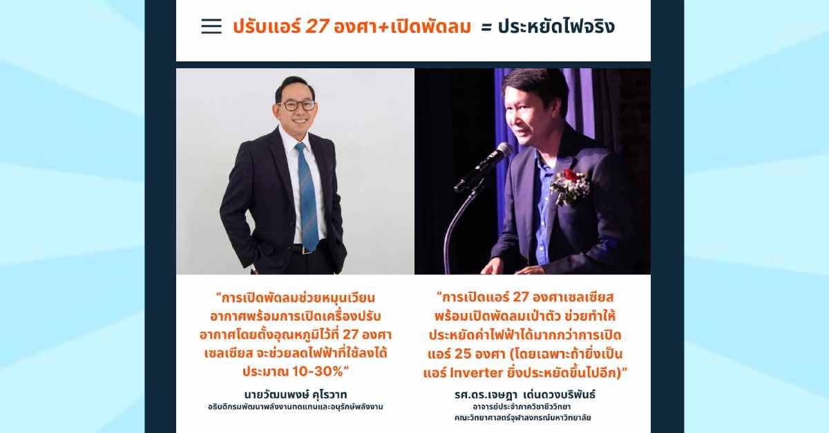 นายวัฒนพงษ์ คุโรวาท อธิบดีกรมพัฒนาพลังงานทดแทนและอนุรักษ์พลังงาน เปิดเผยว่า ตามที่มีกระแสในสื่อสังคมออนไลน์โพสต์ถึง “ทฤษฎีเปิดแอร์ 27 องศาฯ แล้วเปิดพัดลม จะช่วยลดค่าไฟได้ครึ่งนึง จริงไหม” โดยระบุว่า เปิดแอร์ 27 องศาฯ และเปิดพัดลมค่าไฟฟ้าเพิ่มขึ้นจาก 1,000 หน่วย เป็น 1,200 หน่วย โดยเพิ่มขึ้นจากพัดลม 3 ตัว จากกรณีดังกล่าวอาจเกิดจากหลายปัจจัยซึ่งไม่มีข้อมูลประกอบเพียงพอต่อการวิเคราะห์ว่าปริมาณไฟฟ้าที่เพิ่มขึ้นมาจากเครื่องใช้ไฟฟ้าใด พฤติกรรมการใช้เครื่องใช้ไฟฟ้ากับเครื่องใช้ไฟฟ้าอื่นๆ มีการเปลี่ยนแปลงหรือไม่อย่างไร หากพฤติกรรมการใช้ไฟฟ้าไม่เปลี่ยนแปลงสามารถวิเคราะห์เป็นค่าคงที่ และตัวแปรที่เปลี่ยนแปลงไป เกิดจากการปรับตั้งอุณหภูมิ 27 องศาฯ แล้วเปิดพัดลมช่วย จึงจะสามารถวิเคราะห์ได้ว่าค่าไฟฟ้าเพิ่มขึ้นหรือลดลง