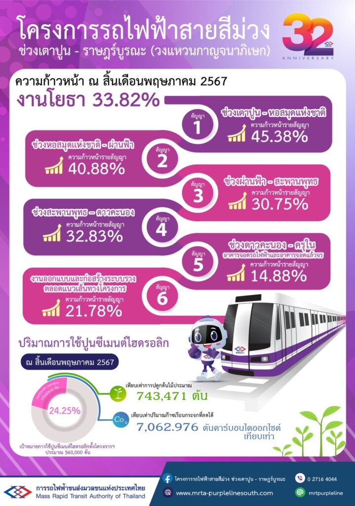 นายวิทยา พันธุ์มงคล รองผู้ว่าการ (ปฏิบัติการ) รักษาการแทนผู้ว่าการ รฟม. กล่าวว่า ปัจจุบัน รฟม. มีโครงการรถไฟฟ้าที่อยู่ระหว่างก่อสร้างจำนวน 2 โครงการ ได้แก่ โครงการรถไฟฟ้าสายสีชมพู ส่วนต่อขยาย ช่วงสถานีศรีรัช – เมืองทองธานี และ โครงการรถไฟฟ้าสายสีม่วง ช่วงเตาปูน – ราษฎร์บูรณะ (วงแหวนกาญจนาภิเษก) ซึ่ง รฟม. ได้กำกับดูแลและติดตามการดำเนินงานก่อสร้างของผู้รับจ้าง/ผู้รับสัมปทานอย่างใกล้ชิด โดยมีความก้าวหน้า ณ สิ้นเดือนพฤษภาคม 2567 ดังนี้