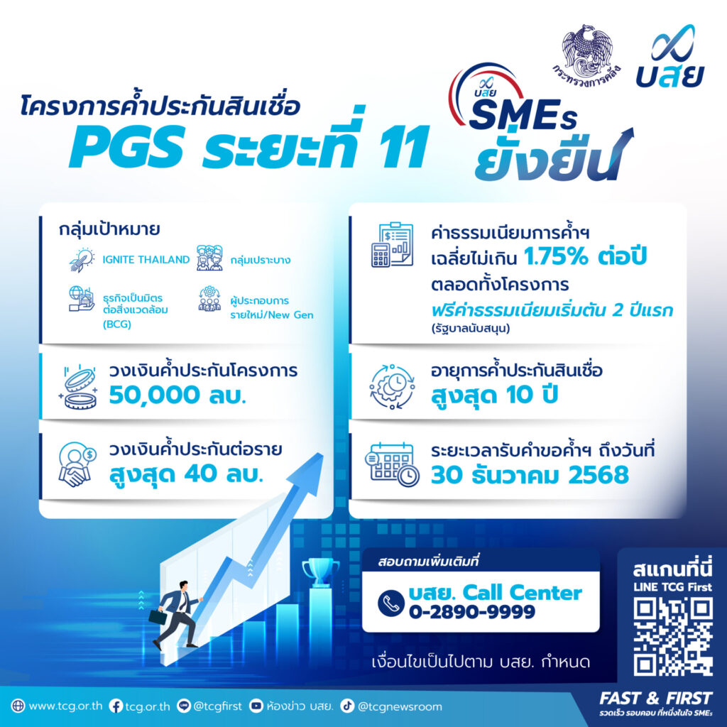 นายสิทธิกร ดิเรกสุนทร กรรมการและผู้จัดการทั่วไป บรรษัทประกันสินเชื่ออุตสาหกรรมขนาดย่อม (บสย.) เปิดเผยว่า ที่ประชุมคณะรัฐมนตรีเมื่อวันที่ 11 มิ.ย.67 มีมติเห็นชอบอนุมัติโครงการค้ำประกันสินเชื่อ PGS ระยะที่ 11 (บสย. SMEs ยั่งยืน) วงเงิน 50,000 ล้านบาท ค่าธรรมเนียมการค้ำฯ เฉลี่ยไม่เกิน 1.75% ต่อปี ตลอดทั้งโครงการ ฟรีค่าธรรมเนียมเริ่มต้น 2 ปีแรก (รัฐบาลสนับสนุน) เพื่อช่วยเหลือผู้ประกอบการ SMEs ให้สามารถเข้าถึงแหล่งเงินทุนได้ง่ายขึ้น มั่นใจช่วย SMEs ได้สินเชื่อกว่า 77,000 ราย กระตุ้นเศรษฐกิจผ่านกลไกค้ำประกันสินเชื่อ ลดความเสี่ยงทางการเงิน และเข้าถึงสินเชื่อในระบบ ตามนโยบายรัฐบาล เติมทุน SMEs เพื่อความยั่งยืนภายใต้โครงการนี้
