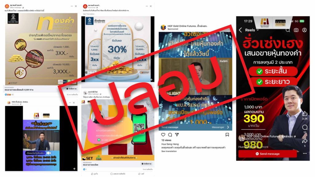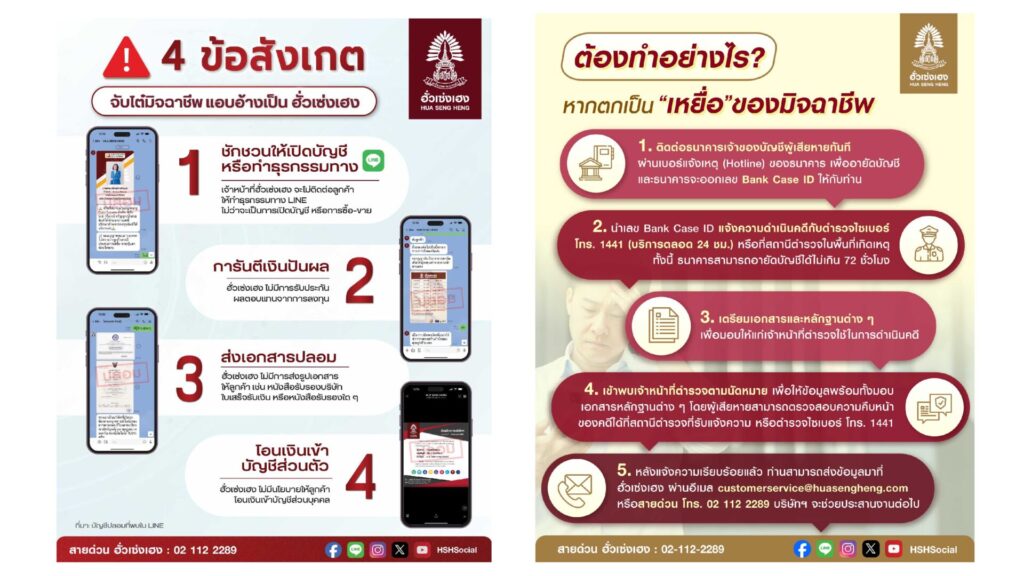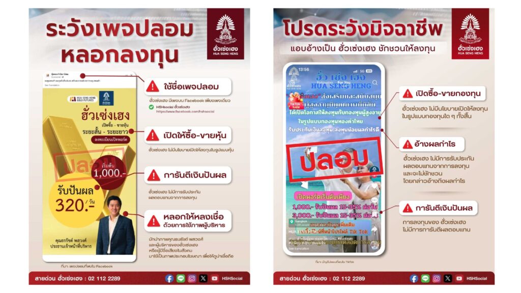 นายธนรัชต์ พสวงศ์ ประธานเจ้าหน้าที่บริหาร กลุ่มบริษัทฮั่วเซ่งเฮง กล่าวว่า สืบเนื่องจากกรณีที่มิจฉาชีพปลอมแปลงบัญชีสร้างเพจปลอม โดยแอบอ้างเป็น “ฮั่วเซ่งเฮง” พร้อมทั้งใช้เครื่องหมายการค้าและภาพผู้บริหารของฮั่วเซ่งเฮง หรือ ภาพบุคคลที่มีชื่อเสียงด้านการลงทุน ศิลปิน ดารา รวมถึงการนำสัญลักษณ์ของสมาคมค้าทองคำ และหน่วยงานที่เกี่ยวข้องกับการลงทุน มาใช้เป็นภาพประกอบโฆษณาบนโซเชียลมีเดีย ทั้งใน Facebook, IG, TikTok และ Line จนมีผู้หลงเชื่อเป็นจำนวนมาก สร้างความเสียหายมูลค่าหลายสิบล้านบาทนั้น กลุ่มบริษัทฮั่วเซ่งเฮง ขอยืนยันว่าไม่มีส่วนเกี่ยวข้องใด ๆ กับการแอบอ้างหรือกล่าวอ้างถึงในทุกกรณี ที่ผ่านมา ฮั่วเซ่งเฮงได้แจ้งเบาะแสและประสานตำรวจไซเบอร์เพื่อปิดกั้นเพจปลอมดังกล่าวอย่างต่อเนื่อง ทั้งนี้ หากประชาชนพบการปลอมแปลงบัญชีหรือเพจปลอมฮั่วเซ่งเฮงบนแพลตฟอร์มต่าง ๆ ในโซเชียลมีเดีย สามารถกดรายงานลิงค์ URL ในช่องทางของแพลตฟอร์มนั้น ๆ หรือแจ้งเบาะแสมายังฮั่วเซ่งเฮง เพื่อประสานผู้ให้บริการแพลตฟอร์มทำการปิดกั้นเพจปลอมต่อไป