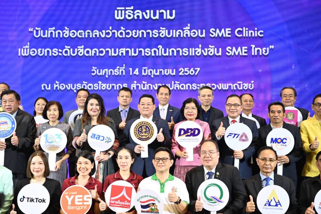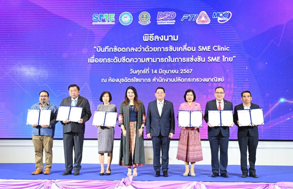 นอกจากนี้ ยังในวันนี้ ยังได้มี ‘พิธีลงนามความร่วมมือว่าด้วยการขับเคลื่อน SME Clinic เพื่อยกระดับขีดความสามารถในการแข่งขัน SME ไทย’ ระหว่าง 6 หน่วยงาน คือ กรมพัฒนาธุรกิจการค้า สำนักงานปลัดกระทรวงพาณิชย์ เครือข่ายธุรกิจ มอค บิส คลับประเทศไทย สมาพันธ์เอสเอ็มอีไทย สภาหอการค้าแห่งประเทศไทย และสภาอุตสาหกรรมแห่งประเทศไทย เพื่อยกระดับมาตรฐานสินค้าและบริการให้แก่ผู้ประกอบการ และสร้างโอกาสทางการค้าทั้งในรูปแบบออนไลน์และออฟไลน์ รวมถึงเชื่อมโยงและสร้างเครือข่ายให้แก่ผู้ประกอบการ โดย SME Clinic จะเป็นศูนย์กลางในการให้คำปรึกษา ช่วยเหลือ ฟื้นฟู และแก้ไขปัญหาสำหรับผู้ประกอบการ SME