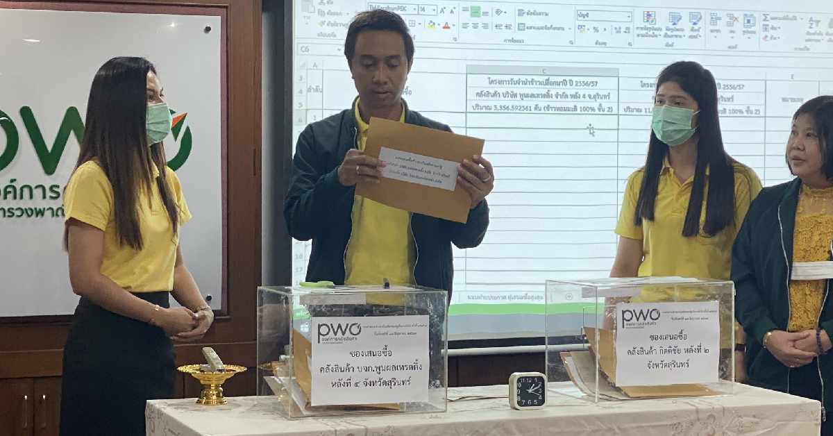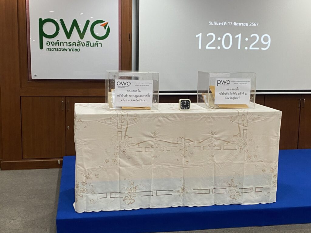 ผู้สื่อข่าวรายงานภายในห้องประชุมองค์การคลังสินค้า (อคส.) ได้ให้เอกชนยื่นซองเปิดประมูลเสนอซื้อ การจำหน่ายข้าวสารในสตอกของรัฐเป็นการทั่วไป ครั้งที่ 1/2567 เป็นข้าวหอมมะลิ 100% ชั้น 2 ประมาณรวมเกือบ 15,000 ตัน ใน 2 คลัง จังหวัดสุรินทร์ หลังจาก อคส.ได้เปิดให้ผู้ที่ผ่านการตรวจสอบคุณสมบัติทั้งหมด 7 ราย ยื่นซองเสนอราคา ตั้งแต่ 09.00-12.00 น. มีบริษัทที่มายื่นซอง 6 ราย หลังจากเปิดซองพบว่า ในคลังสินค้า บริษัท พูนผลเทรดดิ้ง จำกัด หลัง 4 ประมาณข้าวรวม 3,356 ตัน มีผู้ยื่นซองเสนอซื้อครบทั้ง 6 ราย ได้แก่ บริษัท วีเอท อินเตอร์เทรดดิ้ง จังหวัดกำแพงเพชร เสนอราคาประมูลที่ 64.01 ล้านบาท บริษัท ธนสรร ไรซ์ จังหวัดชัยนาท เสนอราคาประมูลที่ 60.4 ล้านบาท บริษัท สหธัญ จังหวัดนครปฐม ยื่นประมูลในราคา 62.7 ล้านบาท บริษัท บีเอ็นเค การเกษตร 2024 จังหวัดนครสวรรค์ เสนอราคาประมูลที่ 53.7 ล้านบาท บริษัท เอส.เอส.เอ็ม.อาร์.การเกษตร จังหวัดนครสวรรค์ เสนอราคาประมูลที่ 56.08 ล้านบาท บริษัท ทรัพย์แสงทอง ไรซ์ จากจังหวัดสุพรรณบุรี เสนอราคาประมูลที่ 40.9 ล้านบาท