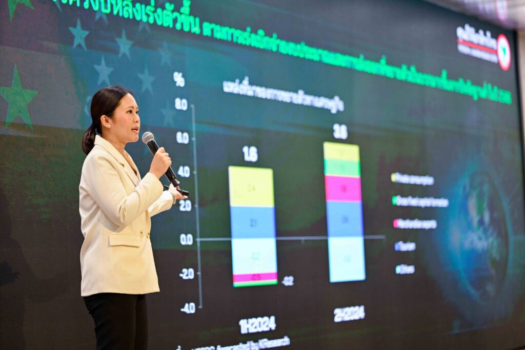 นางสาวณัฐพร ตรีรัตน์ศิริกุล รองกรรมการผู้จัดการ บริษัท ศูนย์วิจัยกสิกรไทย จำกัด มองเพิ่มเติมถึงทิศทางเศรษฐกิจไทยในช่วงครึ่งหลังของปี 2567 ว่า มีแนวโน้มเร่งตัวขึ้นตามการเร่งเบิกจ่ายงบประมาณ และการส่งออกที่ขยายตัวเป็นบวกมากขึ้นจากปัจจัยฐานต่ำในปี 2566 อย่างไรก็ตาม ประเด็นความเสี่ยงจากมาตรการกีดกันทางการค้าที่มีแนวโน้มรุนแรงขึ้นข้างต้น การระบายสินค้าจากกำลังการผลิตส่วนเกินจากจีนมายังตลาดโลกรวมถึงไทย ในขณะที่ปัญหาเชิงโครงสร้างและความสามารถในการแข่งขันที่ลดลงมีผลให้ส่งออกไทยฟื้นตัวได้ช้ากว่าที่คาดการณ์ โดยสรุปภาพรวมทั้งปี 2567 ศูนย์วิจัยกสิกรไทยคาดการณ์การขยายตัวของเศรษฐกิจไทยจะอยู่ที่ 2.6%ชะลอตัวจากระดับ 2.8% ที่เคยคาดการณ์ไว้เดิม ตามการลงทุน และการใช้จ่ายภาครัฐที่ต่ำกว่าคาด ประกอบกับการส่งออกไทยมีแนวโน้มฟื้นตัวช้ากว่าที่คาด คาดปีนี้ส่งออกของไทยจะขยายตัวอยู่ที่ 1.5% ต่ำกว่าที่เคยประมาณการไว้เดิมที่ 2.0%