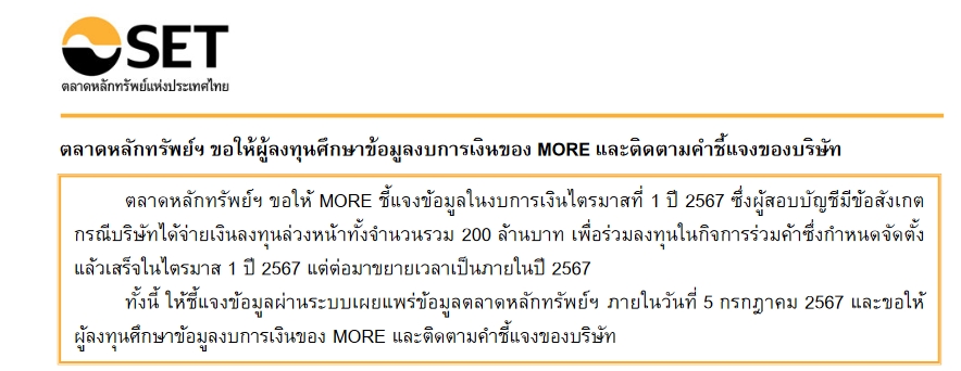 ตลาดหลักทรัพย์ฯ แจ้งให้บริษัท มอร์ รีเทิร์น จำกัด (มหาชน) หรือ MORE ชี้แจงข้อมูลในงบการเงินไตรมาสที่ 1 ปี 2567 ซึ่งผู้สอบบัญชีมีข้อสังเกต กรณีบริษัทได้จ่ายเงินลงทุนล่วงหน้าทั้งจำนวน 200 ล้านบาท เพื่อร่วมลงทุนในกิจการร่วมค้าซึ่งกำหนดจัดตั้งแล้วเสร็จในไตรมาส 1 ปี 2567 แต่ต่อมาขยายเวลาเป็นภายในปี 2567 ทั้งนี้ ให้ชี้แจงภายในวันที่ 5 กรกฎาคม และขอให้ผู้ลงทุนศึกษาข้อมูลงบการเงินของ MORE และติดตามคำชี้แจงของบริษัท