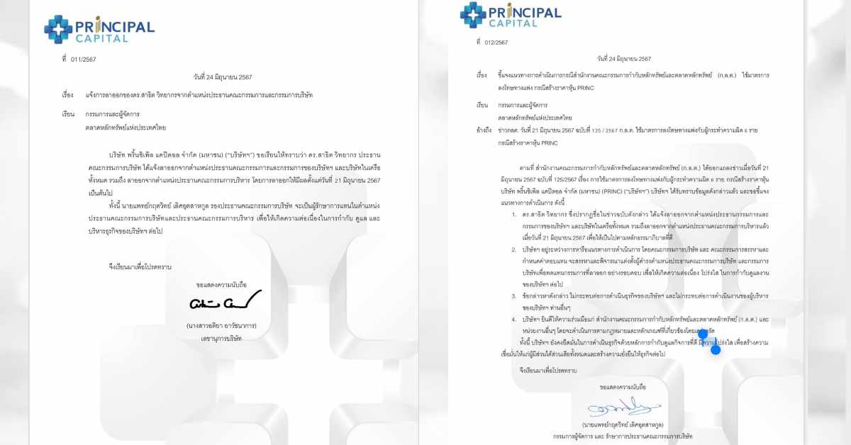 วันนี้ (24 มิ.ย.) บริษัท พริ้นซิเพิล แคปิตอล จำกัด (มหาชน) หรือ PRINC ทำหนังสือ 2 ฉบับ แจ้งถึงกรรมการและผู้จัดการตลาดหลักทรัพย์แห่งประเทศไทย (ตลท.) โดยฉบับแรกระบุว่า ดร.สาธิต วิทยากร ประธานคณะกรรมการบริษัท ได้แจ้งลาออกจากตำแหน่งประธานคณะกรรมการและกรรมการของบริษัทฯ และบริษัทในเครือ ทั้งหมด รวมถึงลาออกจากตำแหน่งประธานคณะกรรมการบริหาร มีผลตั้งแต่วันที่ 21 มิ.ย.67 เป็นต้นไป โดยนายแพทย์กฤตวิทย์ เลิศอุตสาหกูล รองประธานคณะกรรมการบริษัท จะเป็นผู้รักษาการแทนในตำแหน่งประธานคณะกรรมการบริษัทและประธานคณะกรรมการบริหาร เพื่อให้เกิดความต่อเนื่องในการกำกับ ดูแล และบริหารธุรกิจของบริษัทฯ ต่อไป