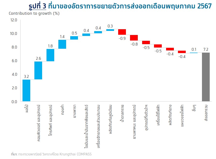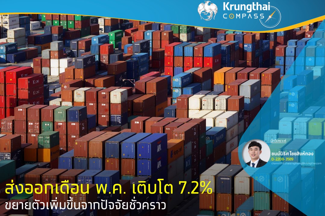 Krungthai COMPASS ธนาคารกรุงไทย เปิดเผยว่ามูลค่าส่งออกเดือน พ.ค.67 อยู่ที่ 26,219.5 ล้านดอลลาร์สหรัฐ เติบโต 7.2%YoY ขยายตัวต่อเนื่องเป็นเดือนที่ 2 โดยเติบโตเร่งขึ้นจากเดือนก่อนที่ 6.8% จากปัจจัยชั่วคราวตามการส่งออกสินค้าเกษตรโดยเฉพาะการส่งออกทุเรียนไปจีนที่ขยายตัวราว 220%เนื่องจากผลผลิตออกสู่ตลาดล่าช้ากว่าปีก่อนจากสภาพภูมิอากาศที่ร้อนกว่าปกติ ประกอบกับการส่งออกทองคำที่กลับมาขยายตัวดีทำให้โดยรวมการส่งออกเดือน พ.ค. ขยายตัวดีขึ้น ขณะที่การส่งออกสินค้าอุตสาหกรรมขยายตัวชะลอลง โดยเริ่มเห็นการส่งออกสินค้าอิเล็กทรอนิกส์มีสัญญาณที่ฟื้นตัวต่อเนื่อง ขยายตัวติดต่อกันเป็นเดือนที่ 2 จากหมวดคอมพิวเตอร์ และหมวดโทรศัพท์ที่ขยายตัวดีตามการส่งออกไปสหรัฐฯ เป็นสำคัญ
