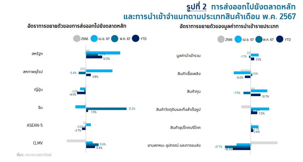 กรุงเทพ 25 มิ.ย. – ธ.กรุงไทย ชี้ส่งออกเดือน พ.ค.67 เติบโต 7.2% ขยายตัวจากปัจจัยชั่วคราว “ทุเรียน-ทองคำ“ จับตาสงครามการค้าสหรัฐ-จีน กดดันส่งออก