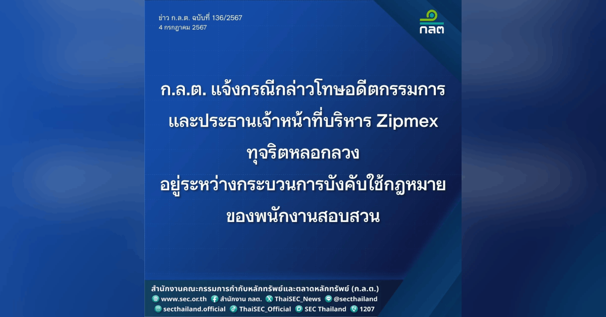 ตามที่สำนักงานคณะกรรมการกำกับหลักทรัพย์และตลาดหลักทรัพย์ (ก.ล.ต.) กล่าวโทษ นายเอกลาภ ยิ้มวิไล อดีตกรรมการและประธานเจ้าหน้าที่บริหาร ซึ่งรับผิดชอบในการดําเนินงานของบริษัท ซิปเม็กซ์ จำกัด หรือ “Zipmex ประเทศไทย” ต่อกองบังคับการปราบปรามการกระทำความผิดเกี่ยวกับอาชญากรรมทางเศรษฐกิจ (บก.ปอศ.) กรณีการทุจริตหลอกลวงด้วยการแสดงข้อความอันเป็นเท็จแก่ประชาชน หรือด้วยการปกปิดความจริง ซึ่งควรบอกให้แจ้งแก่ประชาชน และโดยการหลอกลวงนั้นทำให้ได้ไปซึ่งทรัพย์สินจากประชาชน รวมทั้งกรณีกระทำหรือยินยอมให้กระทำการลงข้อความเท็จหรือไม่ลงข้อความสำคัญในบัญชีหรือเอกสารของ Zipmex ประเทศไทย เพื่อลวงบุคคลใด ๆ ซึ่งเป็นการกระทำการอันเข้าข่ายเป็นความผิดตามมาตรา 82 และมาตรา 88 แห่ง พ.ร.ก. สินทรัพย์ดิจิทัลฯ เมื่อวันที่ 8 กุมภาพันธ์ 2567* แล้วนั้น