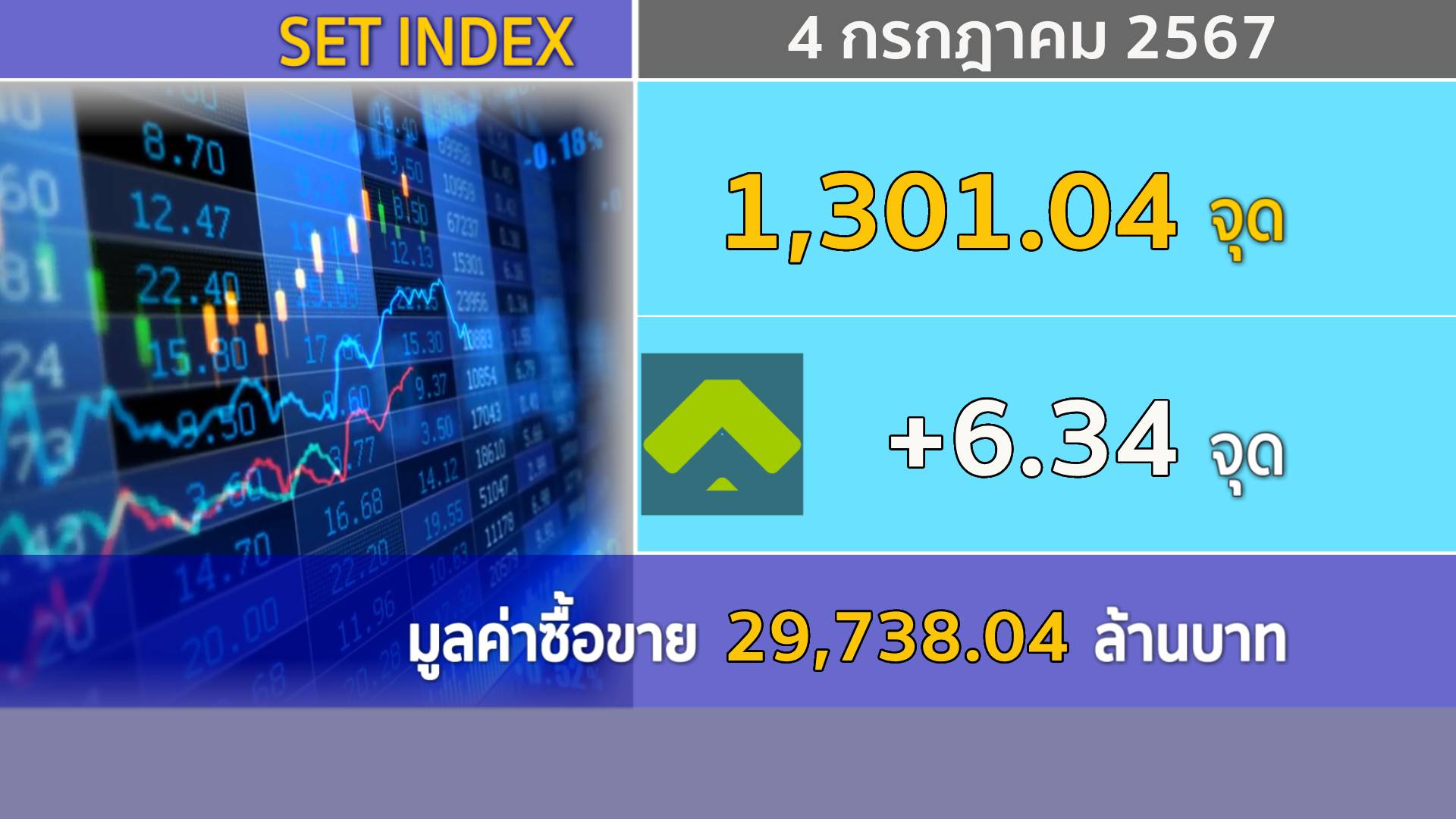 4 ก.ค. – SET ปิดวันนี้ที่ 1,301.04 จุด เพิ่มขึ้น 6.34 จุด (+0.49%) มูลค่าซื้อขายราว 29,738.04 ล้านบาท