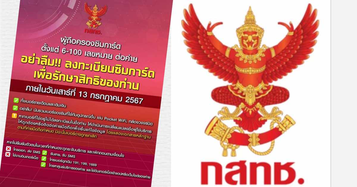 นายไตรรัตน์ วิริยะศิริกุล รองเลขาธิการ รักษาการแทนเลขาธิการคณะกรรมการกิจการกระจายเสียง กิจการโทรทัศน์ และกิจการโทรคมนาคมแห่งชาติ (กสทช.) เปิดเผยว่า ในวันที่ 13 ก.ค. 2567 จะเป็นวันครบกำหนดการยืนยันตัวตนสำหรับผู้ที่ลงทะเบียนซิมการ์ดตั้งแต่ 6-100 เลขหมาย เพื่อระงับยับยั้งการใช้บริการโทรศัพท์เคลื่อนที่ ในการกระทำผิดหรือสนับสนุนการกระทำผิดกฎหมาย สำนักงานคณะกรรมการกิจการกระจายเสียง กิจการโทรทัศน์ และกิจการโทรคมนาคมแห่งชาติ (สำนักงาน กสทช.) ขอความร่วมมือประชาชนที่ได้ลงทะเบียนเปิดใช้ซิมการ์ดตั้งแต่ 6-100 เลขหมายต่อค่าย ดำเนินการยืนยันตัวตนกับผู้ให้บริการโทรศัพท์เคลื่อนที่ในช่องทางที่ผู้ให้บริการแต่ละค่ายกำหนด หากเลยระยะเวลาดังกล่าวเลขหมายจะถูกระงับบริการ ไม่สามารถโทรออก ส่งข้อความสั้น (SMS) หรือใช้งานอินเทอร์เน็ตได้