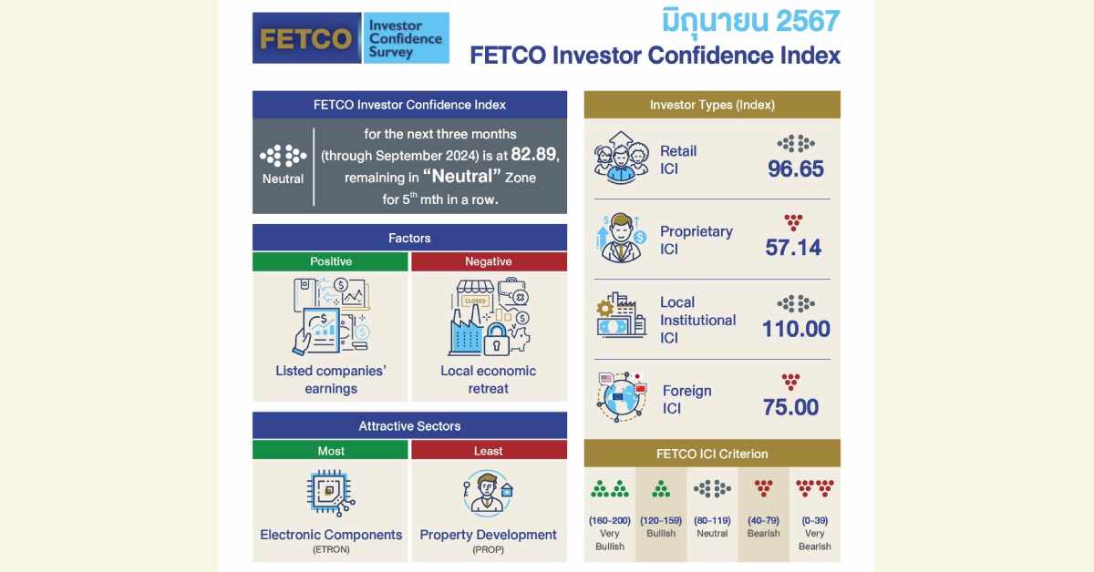 นายกอบศักดิ์ ภูตระกูล ประธานกรรมการสภาธุรกิจตลาดทุนไทย เปิดเผยดัชนีความเชื่อมั่นนักลงทุน (FETCO Investor Confidence Index) ผลสำรวจในเดือนกรกฎาคม 2567 (สำรวจระหว่างวันที่ 20-30 มิถุนายน 2567) พบว่าดัชนีความเชื่อมั่นนักลงทุน (FETCO Investor Confidence Index: ICI) ในอีก 3เดือนข้างหน้าอยู่ที่ระดับ 82.89 ยังคงอยู่ในเกณฑ์ “ทรงตัว” นักลงทุนมองว่าผลประกอบการบริษัทจดทะเบียน เป็นปัจจัยหนุนความเชื่อมั่นมากที่สุด รองลงมาคือมาตรการกระตุ้นเศรษฐกิจของภาครัฐ และการฟื้นตัวของภาคการท่องเที่ยว ในขณะที่ปัจจัยที่ฉุดความเชื่อมั่นนักลงทุนมากที่สุด ได้แก่ การถดถอยของเศรษฐกิจในประเทศ รองลงมาคือการไหลออกของเงินทุน และสถานการณ์การเมืองในประเทศ