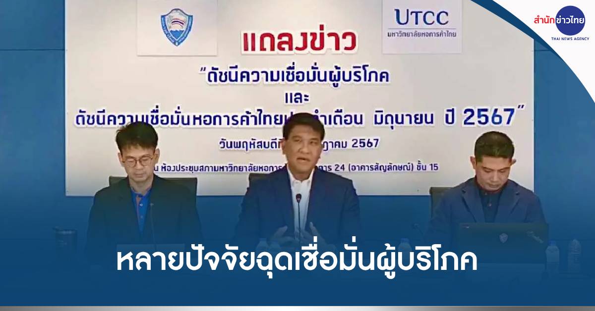 นายธนวรรธน์ พลวิชัย อธิการบดีมหาวิทยาลัยหอการค้าไทย และประธานที่ปรึกษาศูนย์พยากรณ์เศรษฐกิจและธุรกิจ กล่าวถึงผลการสำรวจดัชนีความเชื่อมั่นของผู้บริโภคประจำเดือนมิถุนายน 2567 ยังปรับตัวลดลงต่อเนื่องเป็นเดือนที่ 4 และอยู่ในระดับต่ำสุดในรอบ 9 เดือน นับตั้งแต่เดือนตุลาคม 2566 เป็นต้นมา เนื่องจากผู้บริโภคเริ่มกลับมากังวลว่าการเมืองไทยเริ่มขาดเสถียรภาพหลังจากศาลรัฐธรรมนูญรับคำร้องของ 40 สว. เกี่ยวกับคุณสมบัติของนายกรัฐมนตรี และกังวลเศรษฐกิจไทยชะลอตัวลงและฟื้นตัวช้า เพราะยังไม่เห็นมาตรการกระตุ้นเศรษฐกิจที่ชัดเจน ประกอบกับราคาพลังงานปรับตัวสูงขึ้นโดยเฉพาะน้ำมันเบนซิน และผู้บริโภคยังคงมีความกังวลเกี่ยวกับสถานการณ์เศรษฐกิจโลกชะลอตัว สงครามในตะวันออกกลางที่ยังคงยืดเยื้อบานปลาย อาจเป็นปัจจัยที่เพิ่มแรงกดดันของการฟื้นตัวล่าช้าของเศรษฐกิจไทย