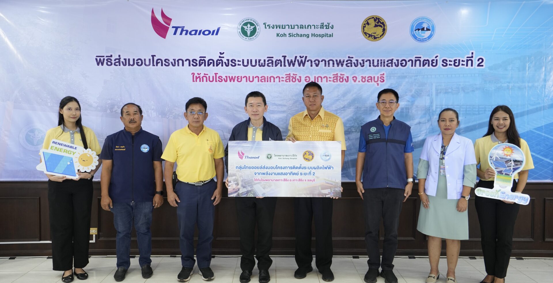 นายบัณฑิต ธรรมประจำจิต ประธานเจ้าหน้าที่บริหารและกรรมการผู้จัดการใหญ่ บริษัท ไทยออยล์ จำกัด (มหาชน) ส่งมอบระบบผลิตไฟฟ้าจากพลังงานแสงอาทิตย์ให้กับทันตแพทย์หญิงอานะสิทธิ์ ศัลยพงษ์ ผู้อำนวยการ โรงพยาบาลเกาะสีชัง โดยมี คุณธวัชชัย ศรีทอง ผู้ว่าราชการจังหวัดชลบุรี คณะผู้บริหารของบริษัท ไทยออยล์ จำกัด (มหาชน) และผู้แทนจากหน่วยงานภาครัฐ ร่วมเป็นสักขีพยานในการส่งมอบ ณ ห้องประชุมใหญ่ ชั้น 4 โรงพยาบาลเกาะสีชัง อ.เกาะสีชัง จ.ชลบุรี พร้อมลงพื้นที่ตรวจเยี่ยมการติดตั้งระบบ และมอบถุงเติมรัก ปันสุข เพื่อสนับสนุนงานบริการทางการแพทย์ให้แก่ประชาชาชนที่มารับบริการด้านสาธารณสุขอีกด้วย