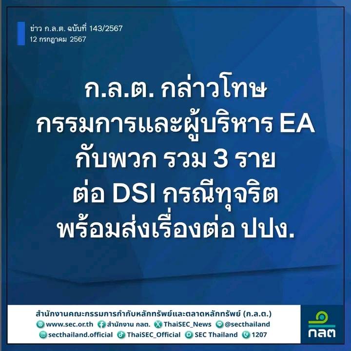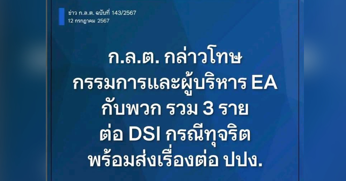 กรุงเทพฯ 12 ก.ค. – ก.ล.ต. กล่าวโทษบุคคลรวม 3 ราย คือ นายสมโภชน์ อาหุนัย และนายอมร ทรัพย์ทวีกุล ซึ่งเป็นกรรมการและผู้บริหารบริษัท พลังงานบริสุทธิ์ จำกัด (มหาชน) (EA) รวมทั้งนายพรเลิศ เตชะรัตโนภาส ต่อกรมสอบสวนคดีพิเศษ (DSI) กรณีร่วมกระทำการทุจริต เพื่อแสวงหาประโยชน์ที่มิควรได้แก่ตนเอง และ/หรือผู้อื่น ทำให้ EA และบริษัทย่อยเสียหาย พร้อมกันนี้ได้ส่งเรื่องต่อไปยังสำนักงานป้องกันและปราบปรามการฟอกเงิน (ปปง.)