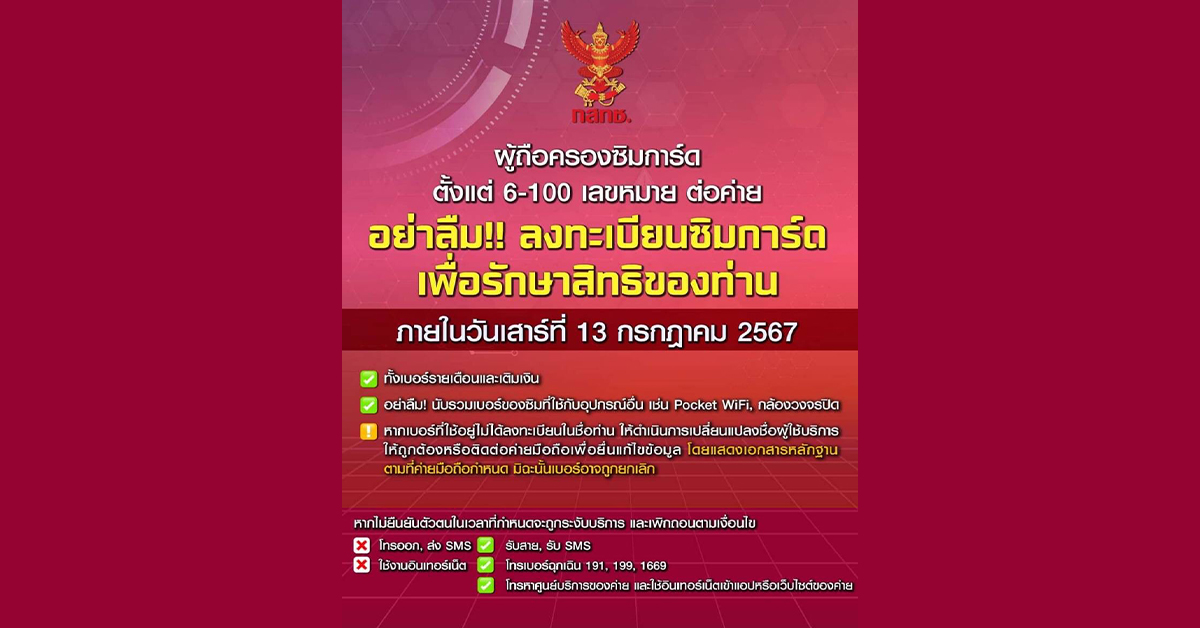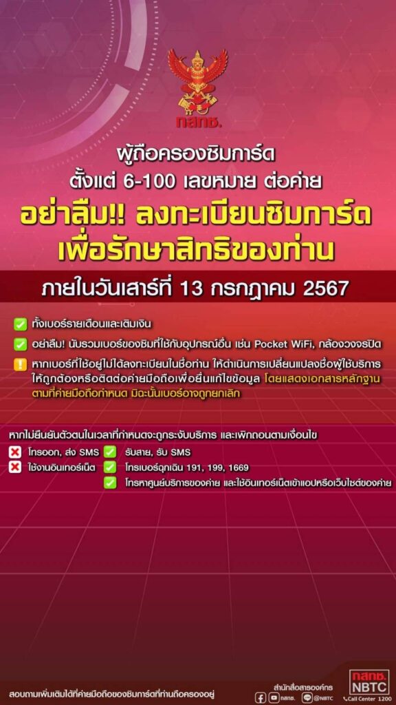 สำนักงานคณะกรรมการกิจการกระจายเสียง กิจการโทรทัศน์ และกิจการโทรคมนาคมแห่งชาติ (สำนักงาน กสทช.) ขอความร่วมมือประชาชนที่ได้ลงทะเบียนเปิดใช้ซิมการ์ดตั้งแต่ 6-100 เลขหมายต่อค่าย ดำเนินการยืนยันตัวตนกับผู้ให้บริการโทรศัพท์เคลื่อนที่ในช่องทางที่ผู้ให้บริการแต่ละค่ายกำหนด หากเลยระยะเวลาดังกล่าวเลขหมายจะถูกระงับบริการ ไม่สามารถโทรออก ส่งข้อความสั้น (SMS) หรือใช้งานอินเทอร์เน็ตได้