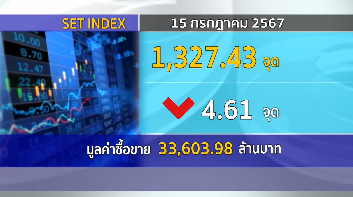 กทม. 15 ก.ค.-SET ปิดวันนี้ที่ 1,327.43 จุด ลดลง 4.61 จุด (-0.35%) มูลค่าซื้อขาย 33,603.98 ล้านบาท