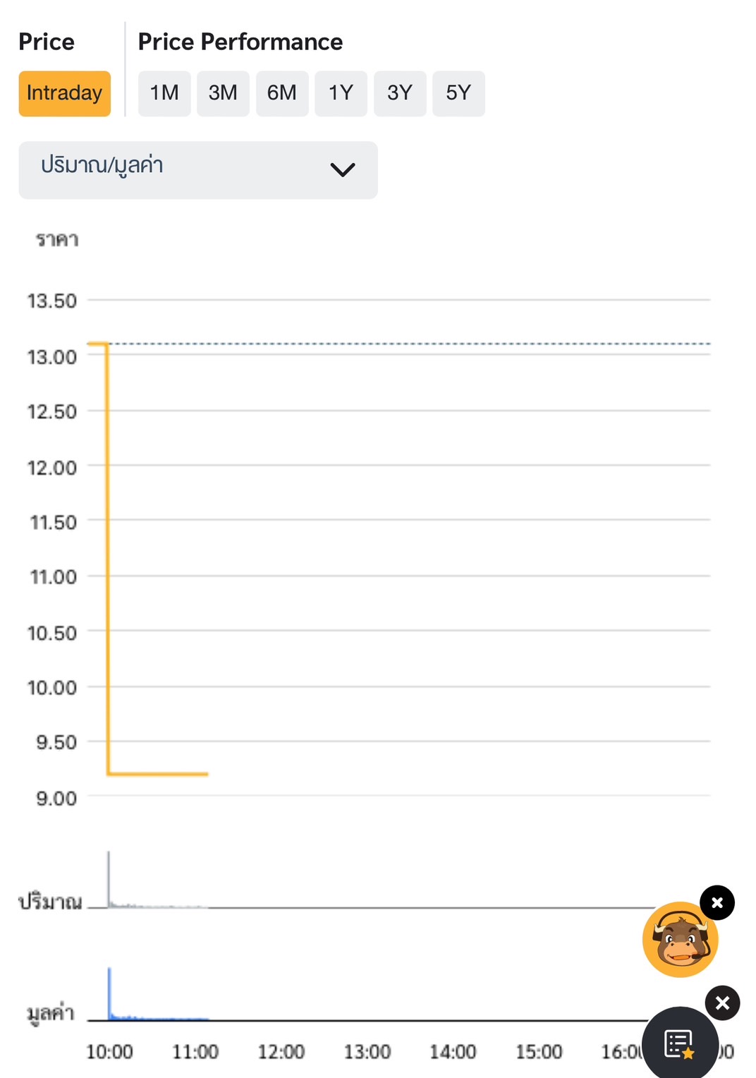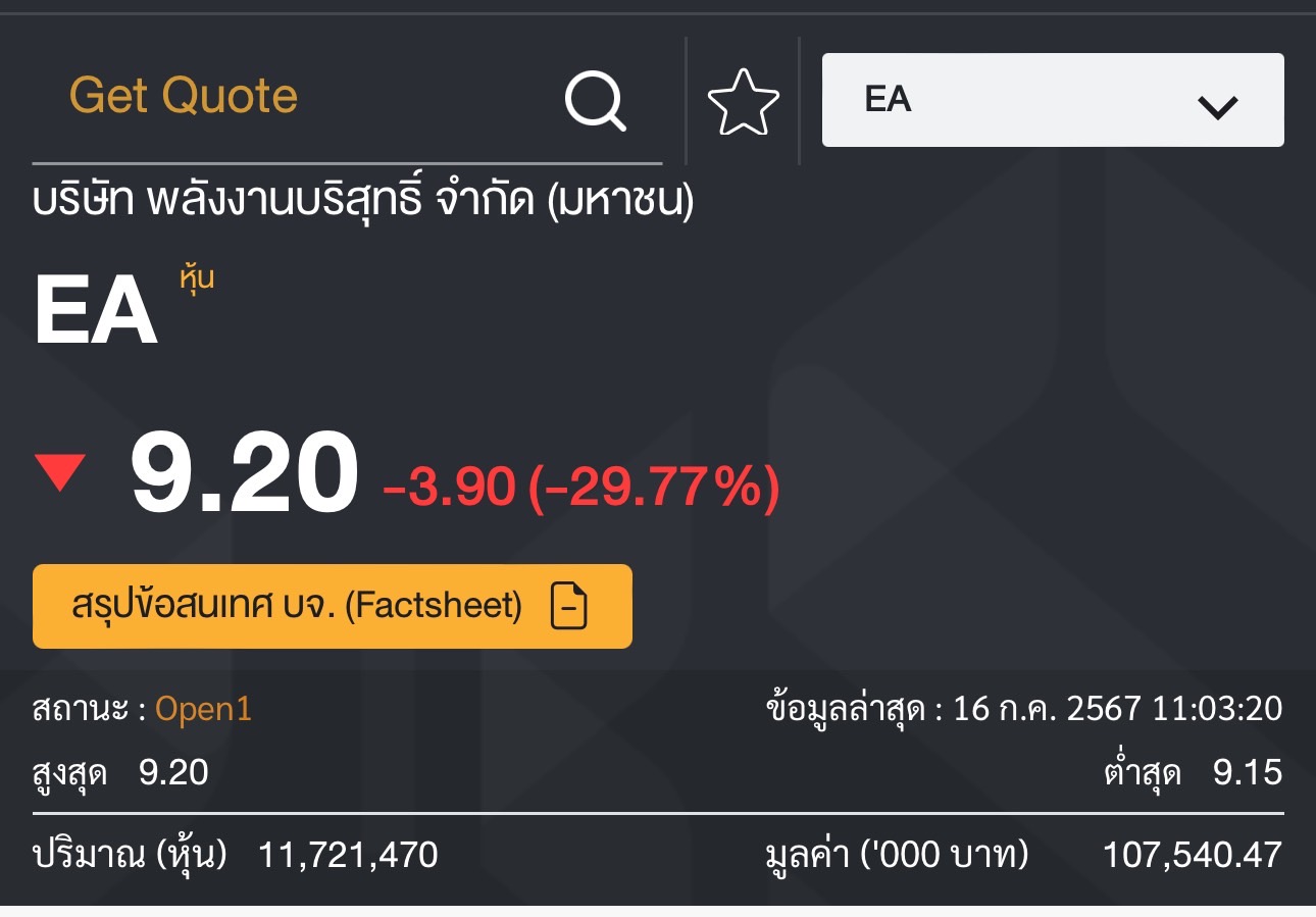 ผู้สื่อข่าวรายงานความเคลื่อนไหว เปิดตลาดหุ้นไทยภาคเช้า วันนี้ (16 ก.ค.67) ดัชนีอยู่ที่ 1,327.77 จุด เพิ่มขึ้น 0.34 จุด มูลค่าการซื้อขาย 1,137.02 ล้านบาท วันที่ 16 กรกฎาคม 2567 ขณะที่ราคาหุ้น บมจ.พลังงานบริสุทธิ์ (EA) เปิดตลาด ร่วงแรงลงไปแตะระดับต่ำสุดของวัน หรือระดับฟลอร์ (Floor) ที่ระดับราคา 9.20 บาท เป็นการปรับตัวลดลง 3.9 บาท หรือติดลบ 29.77% เมื่อเทียบจากราคาวันก่อนหน้า