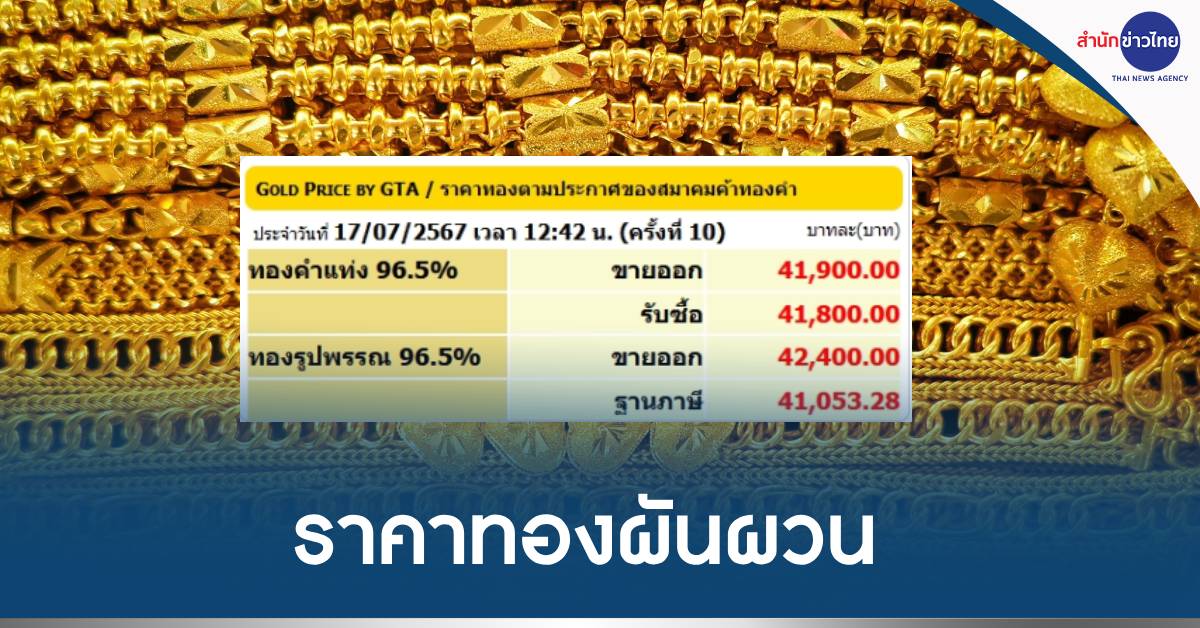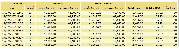 สมาคมค้าทองคำ รายงานว่า ราคาทองคำวันนี้ (17 ก.ค.) ผันผวน เปิดตลาดตั้งแต่เช้าจนถึงเวลา 12.42 น. ราคาปรับเปลี่ยน 10 ครั้ง โดยล่าสุดทองแท่งขายออก บาทละ 41,900 บาท และทองรูปพรรณ ขายออก 42,400 บาท ที่ราคาทองสปอต 2,467 ดอลลาร์สหรัฐ/ออนซ์ อัตราแลกเปลี่ยน 35.92 บาท/ดอลลาร์ฯ โดยราคาทองคำเช้าวันนี้ เปิดตลาดครั้งที่ 1 พุ่ง 500 บาท จากวานนี้ ที่ทองคำแท่ง 42,150 บาท ทองรูปพรรณ 42,650 บาท จากราคาตลาดโลกที่พุ่งแรง นับเป็นราคาสูงสุดหรือนิวไฮ ตามราคาสปอตที่นิวไฮที่ 2,482 ดอลลาร์/ออนซ์ อัตราแลกเปลี่ยน 35.93 บาท/ดอลลาร์ฯ ซึ่งจากบาทแข็งค่าจึงทำให้ทองคำไทยไม่ได้สูงไปกว่านี้