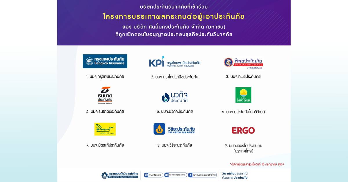 17 ก.ค. – สมาคมประกันวินาศภัยไทย ผนึกกำลังบริษัทสมาชิก ช่วยเหลือผู้เอาประกันภัยที่ได้รับผลกระทบ กรณี บมจ.สินมั่นคงประกันภัย ถูกเพิกถอนใบอนุญาต