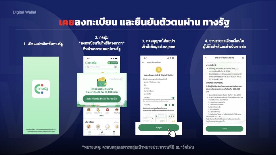นายเผ่าภูมิ โรจนสกุล รัฐมนตรีช่วยว่าการกระทรวงการคลัง กล่าวว่า รัฐบาลกำหนดการเข้าร่วมโครงการฯ เพื่อให้ประชาชนทั่วไปลงทะเบียน ระหว่างวันที่ 1 สิงหาคม – 15 กันยายน 2567 จะดำเนินการผ่านแอปพลิเคชัน “ทางรัฐ” บนสมาร์ตโฟน โดยไม่จำกัดจำนวนประชาชนเข้าร่วมใช้สิทธิ์ ลงทะเบียนได้ตั้งแต่หลังเที่ยงคืนของวันที่ 31 ก.ค.67 ตลอด 24 ชั่วโมง เพราะลงทะเบียนผ่านออนไลน์ ”แอปทางรัฐ“ เพื่อลดความแออัด จึงอยากให้ ประชาชนทำการยืนยันตัวตนล่วงหน้าตั้งแต่วันนี้เป็นต้นไป โดยสามารถดาวน์โหลดแอปพลิเคชัน “ทางรัฐ” ได้โดยตรงจากแอปพลิเคชัน “App Store” สำหรับระบบปฏิบัติการไอโอเอส (iOS) และแอปพลิเคชัน “Google Play” สำหรับระบบปฏิบัติการแอนดรอยด์ (Android) บนโทรศัพท์สมาร์ตโฟน ตั้งเป้าหมายผู้ลงทะเบียน 45 – 50 ล้านคน “แอปทางรัฐ“ ไม่มีส่งคลิบลิงค์ ไม่มีส่งต่อ อย่างหลงเชื่อมหลอกลวงไซเบอร์ ขณะนี้ตำรวจไซเบอร์ ติดตามดูแลเรื่องนี้อย่างใกล้ชิด