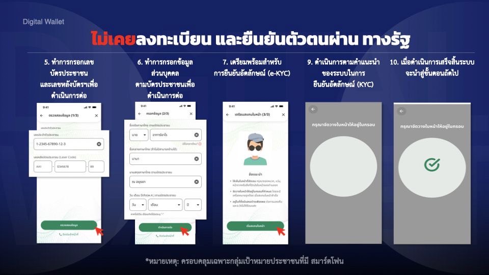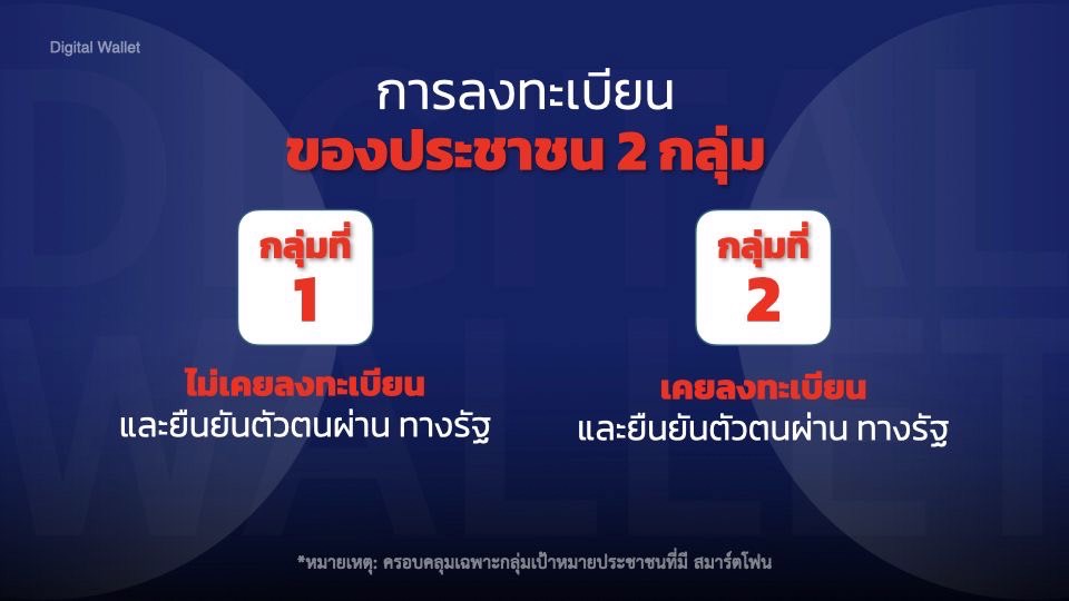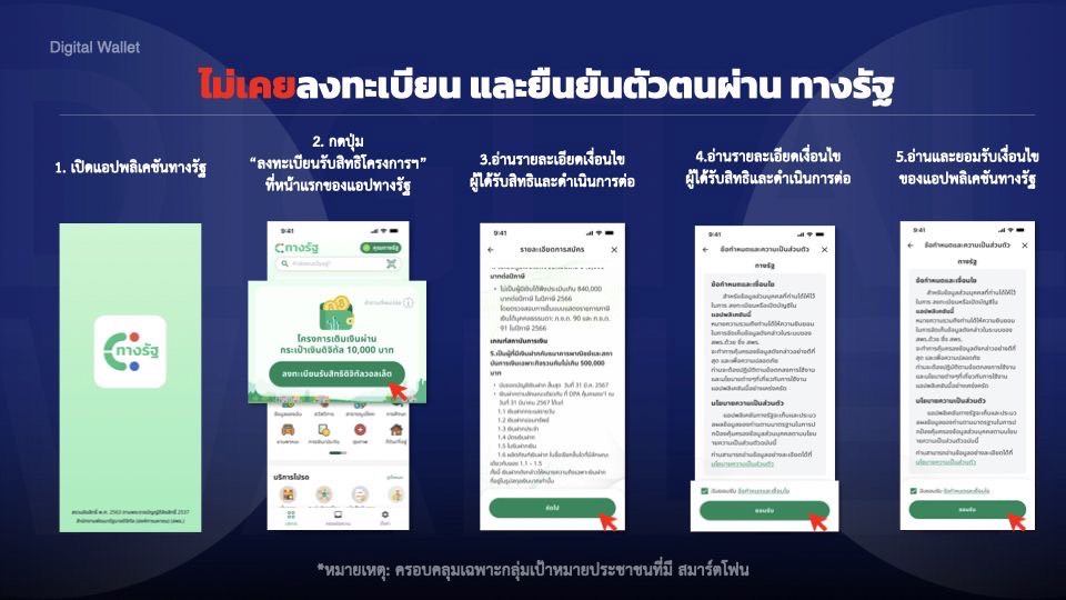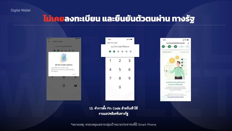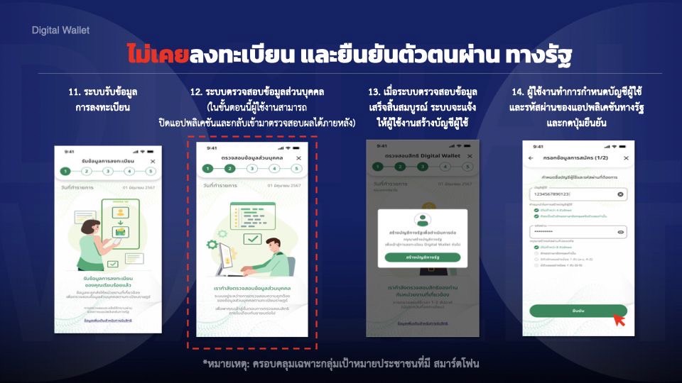 สำหรับการลงทะเบียนประชาชนกลุ่มที่ไม่มีสมาร์ตโฟน กำลังเตรียมการให้เข้าร่วมโครงการฯ ในช่วงต่อไป โดยจะให้มีการลงทะเบียนและยืนยันตัวตนผ่านช่องทางที่กำหนด (ระหว่างวันที่ 16 กันยายน – 15 ตุลาคม 2567) โดยต้อง ตรวจสอบคุณสมบัติ สถานะบุคคล และที่อยู่ตามทะเบียนบ้าน เช่นเดียวกับกลุ่มผู้มีสมาร์ตโฟน สำหรับส่วนของการใช้จ่ายนั้นอยู่ระหว่างการพิจารณาให้ใช้สิทธิผ่านบัตรประจำตัวประชาชน แต่การใช้สิทธิซื้อสินค้าจากร้านค้าจะทำได้ในวงแคบกว่าการใช้สิทธิของประชาชนกลุ่มที่มีสมาร์ตโฟน ดังนั้น การลงทะเบียนผ่านสมาร์ตโฟน จึงใช้งานได้สะดวกกว่า จึงแนะนำให้พยายามลงทะเบียนผ่านทางสมาร์ตโฟนก่อนเป็นอันดับแรก