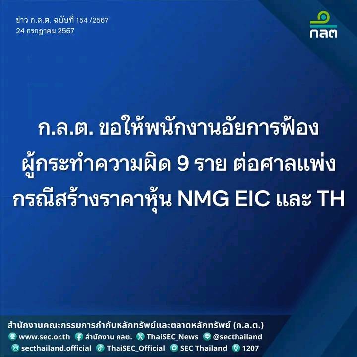 กรุงเทพฯ 24 ก.ค. – สำนักงานคณะกรรมการกำกับหลักทรัพย์และตลาดหลักทรัพย์ (ก.ล.ต.) ขอให้พนักงานอัยการฟ้องผู้กระทำความผิด 9 ราย กรณีสร้างราคาหุ้น NMG EIC และ TH เพื่อขอให้กำหนดมาตรการลงโทษทางแพ่ง รวมทั้งกำหนดระยะเวลาห้ามซื้อขายหลักทรัพย์และสัญญาซื้อขายล่วงหน้า และห้ามเป็นกรรมการหรือผู้บริหาร (แล้วแต่กรณี) ในอัตราสูงสุดตามกฎหมาย