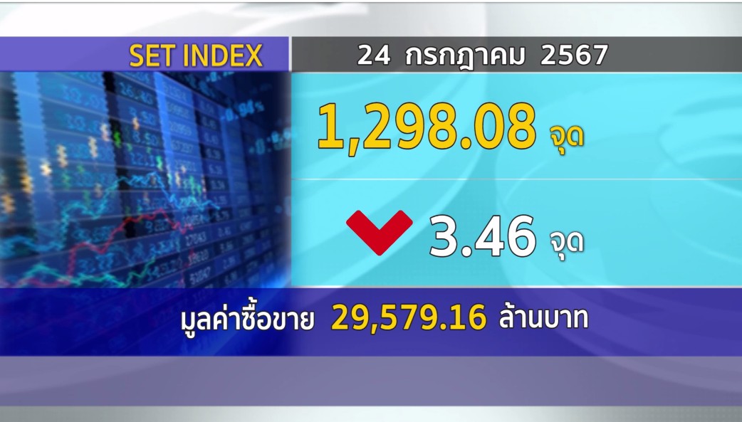 กทม. 24 ก.ค. – SET ปิดวันนี้ที่ 1,298.08 จุด ลดลง 3.46 จุด (-0.27%) มูลค่าซื้อขาย 29,631.37 ล้านบาท