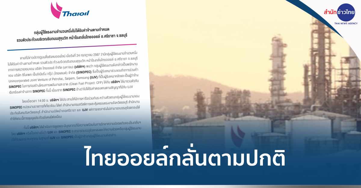 กรุงเทพฯ 25 ก.ค. – บมจ.ไทยออยล์ ย้ำโรงกลั่นเดินเครื่องปกติ และโครงการพลังงานสะอาด (Clean Fuel Project: CFP) ยังเดินหน้าตามแผน พร้อมประสานหน่วยงานเกี่ยวข้องร่วมแก้ปัญหากลุ่มผู้ใช้แรงงาน ลูกจ้างผู้รับเหมา SINOPEC ชุมนุมประท้วง เพราะไม่ได้รับค่าจ้างตามกำหนด