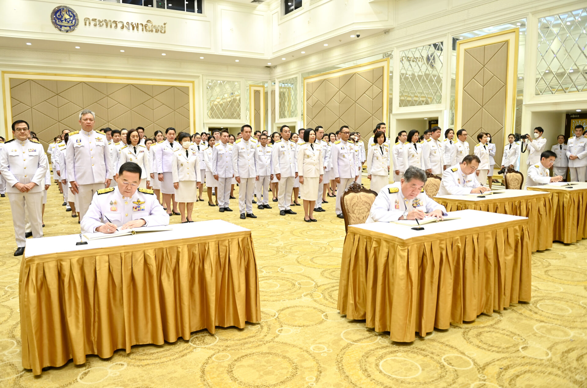 ในการนี้ นายภูมิธรรม ได้ถวายความเคารพหน้าพระบรมฉายาลักษณ์พระบาทสมเด็จพระเจ้าอยู่หัวพร้อมกล่าวคำถวายพระพรชัยมงคล จากนั้นได้กล่าวนำข้าราชการกระทรวงพาณิชย์กล่าวคำถวายสัตย์ปฏิญาณ เพื่อการเป็นข้าราชการที่ดีและพลังของแผ่นดิน และร่วมร้องสรรเสริญพระบารมีและเพลงสดุดีจอมราชา ก่อนร่วมลงนามถวายพระพรพระบาทสมเด็จพระพระเจ้าอยู่หัว.-514-สำนักข่าวไทย