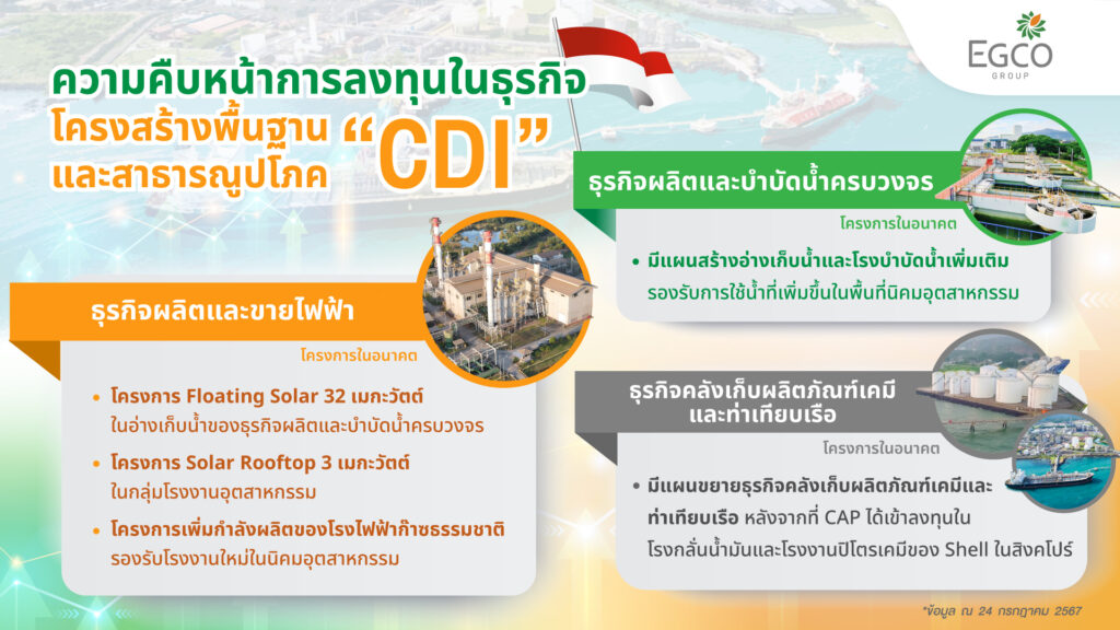 ดร.จิราพร ศิริคำ กรรมการผู้จัดการใหญ่ EGCO Group เปิดเผยว่านับตั้งแต่ EGCO Group เข้าถือหุ้น 30% ใน CDI บริษัทโครงสร้างพื้นฐานและสาธารณูปโภค ในเครือบริษัท พีที จันทรา อศรี แปซิฟิก ทีบีเค จำกัด (PT Chandra Asri Pacific Tbk – CAP) ผู้นำในธุรกิจเคมีและโครงสร้างพื้นฐานในอินโดนีเซีย เมื่อช่วงปลายปี 2566 EGCO Group ได้ทำงานร่วมกับ CAP และ CDI อย่างใกล้ชิด เพื่อร่วมกันพัฒนา CDI ให้เป็นแพลตฟอร์มการลงทุนด้านสาธารณูปโภคและโครงสร้างพื้นฐานชั้นนำในภูมิภาคอาเซียน โดยมุ่งเน้นการขยายและการพัฒนาโครงการที่มีอยู่ในปัจจุบันของ CDI ควบคู่กับการลงทุนเชิงกลยุทธ์ ทั้งในรูปแบบการร่วมทุนกับพันธมิตร การควบรวมกิจการ และความร่วมมือทางธุรกิจที่เกี่ยวข้องในธุรกิจผลิตไฟฟ้า ธุรกิจน้ำ ธุรกิจคลังเก็บผลิตภัณฑ์เคมีและท่าเทียบเรือและเรือขนส่งสินค้า เพื่อเพิ่มประสิทธิภาพการใช้สินทรัพย์ที่มีอยู่ให้เกิดประโยชน์สูงสุด ตลอดจนการขยายฐานลูกค้าและรองรับความต้องการที่เพิ่มขึ้นในอนาคต