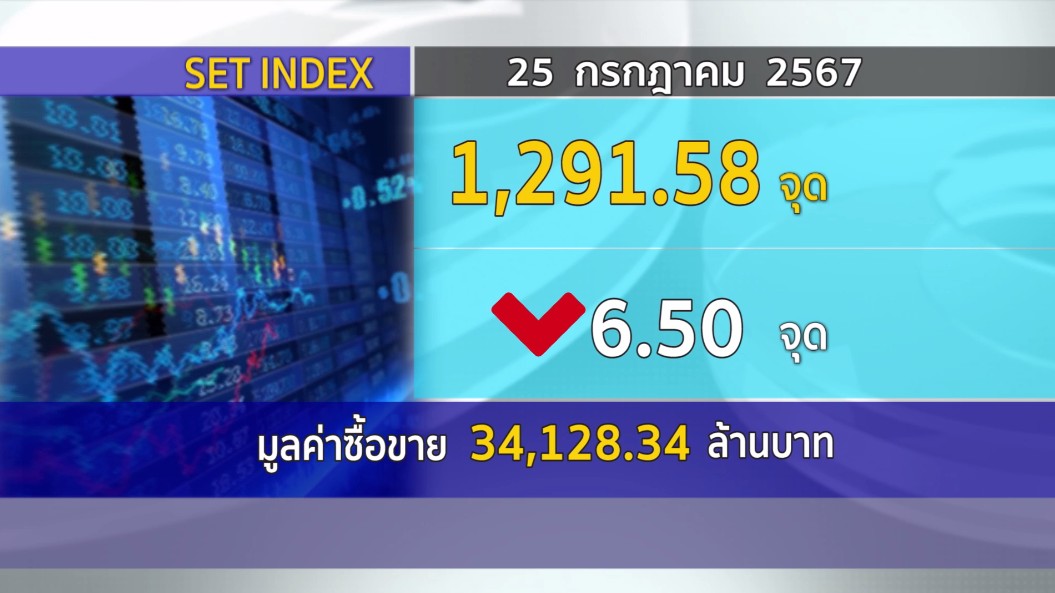 กทม. 25 ก.ค. – SET ปิดวันนี้ที่ 1,291.58 จุด ลดลง 6.50 จุด (-0.50%) มูลค่าซื้อขาย 34,178.76 ล้านบาท