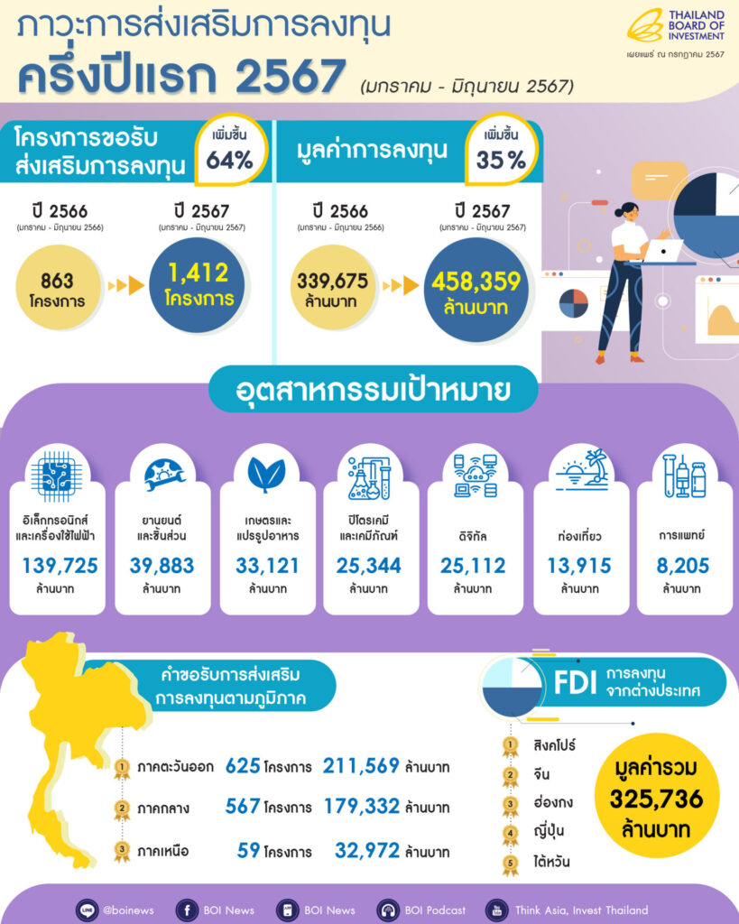 กรุงเทพฯ 25 ก.ค. – บีโอไอ เผยยอดขอรับการส่งเสริมการลงทุน 6 เดือนแรกปี 2567 ยังเติบโตต่อเนื่อง ทั้งจำนวนโครงการและเงินลงทุน โดยมีคำขอรับการส่งเสริม 1,412 โครงการ เงินลงทุน 458,359 ล้านบาท เพิ่มขึ้น ร้อยละ 35 นำโดย 3 กลุ่มอุตสาหกรรมเป้าหมาย อิเล็กทรอนิกส์และเครื่องใช้ไฟฟ้า ยานยนต์และชิ้นส่วน เกษตรและแปรรูปอาหาร ขณะที่การลงทุนจากต่างประเทศ (FDI) สิงคโปร์อันดับหนึ่ง ตามด้วยจีน และฮ่องกง ครึ่งปีหลังเร่งแผนโรดโชว์ชิงลงทุนฮับภูมิภาค ควบคู่กับการปรับโครงสร้างการผลิต เพื่อเพิ่มศักยภาพการแข่งขัน