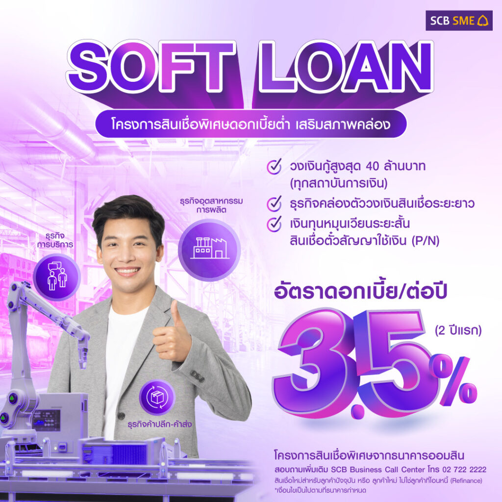 กรุงเทพฯ 26 ก.ค. – ธนาคารไทยพาณิชย์ ร่วมสนับสนุนภาครัฐช่วยเอสเอ็มอีไทยเข้าถึงสินเชื่อผ่านโครงการสินเชื่อดอกเบี้ยต่ำ (Soft Loan) มุ่งเติมสภาพคล่องให้ผู้ประกอบการเพิ่มขีดความสามารถในการแข่งขัน ฝ่าทุกความท้าทายทางเศรษฐกิจ โดยให้วงเงินสินเชื่อสูงสุด 40 ล้านบาท ดอกเบี้ยต่ำไม่เกิน 3.50% ต่อปี ตั้งเป้าปล่อยสินเชื่อ ผ่านโครงการฯ ไม่ต่ำกว่า 10,000 ล้านบาท