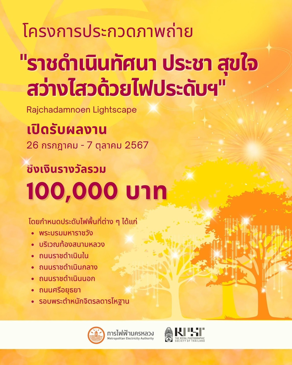MEA ร่วมกับ สมาคมถ่ายภาพแห่งประเทศไทย ในพระบรมราชูปถัมภ์ เชิญชมไฟประดับและบันทึกภาพถ่ายทอดเรื่องราวความงดงามของไฟประดับ ในโครงการประกวดภาพถ่าย “โครงการราชดำเนินทัศนา ประชา สุขใจ สว่างไสวด้วยไฟประดับฯ” เนื่องในโอกาสพระราชพิธีมหามงคลเฉลิมพระชนมพรรษา 6 รอบ วันที่ 28 กรกฎาคม 2567