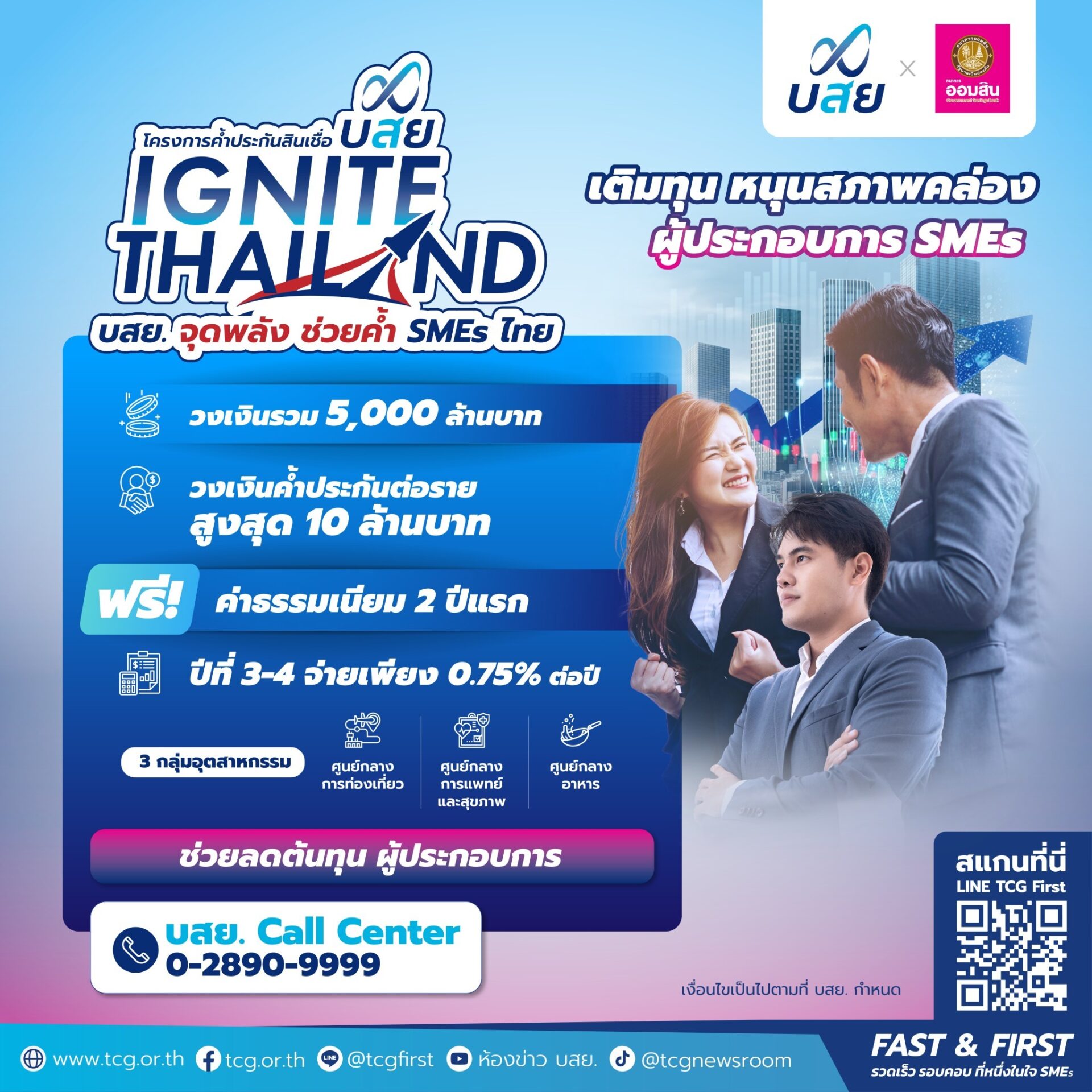 บสย. ผนึกธนาคารออมสิน เดินหน้าค้ำประกันสินเชื่อ IGNITE THAILAND วงเงินค้ำประกันรวม 5,000 ล้านบาท ฟรี! ค่าธรรมเนียม 2 ปีแรก ลดภาระผู้ประกอบการ หนุน SMEs กลุ่ม “ท่องเที่ยว-การแพทย์และสุขภาพ-อาหาร และ Supply Chain” เข้าถึงแหล่งเงินทุน ขับเคลื่อนเศรษฐกิจประเทศเติบโตระยะยาว