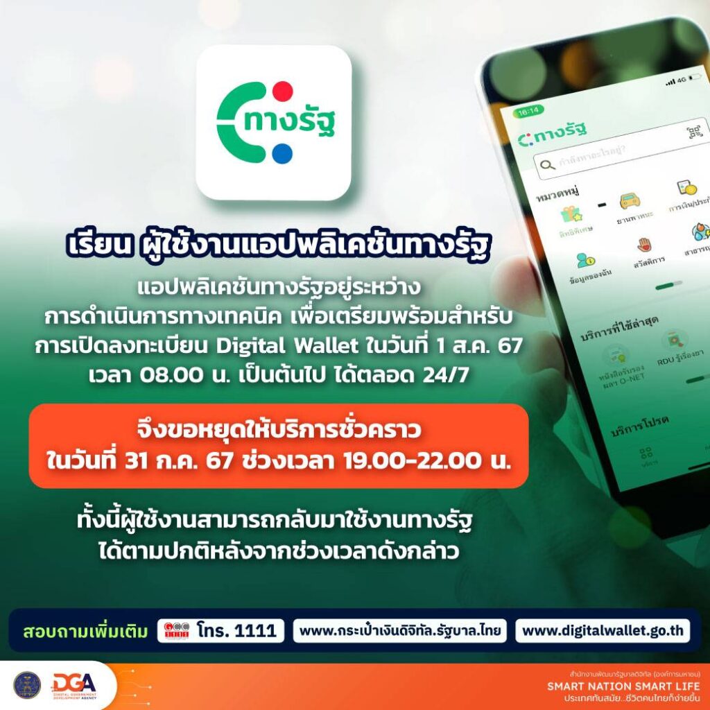 นายเผ่าภูมิ โรจนสกุล รัฐมนตรีช่วยว่าการกระทรวงการคลัง เปิดเผยถึงการลงทะเบียนรับสิทธิโครงการเติมเงิน 10,000 บาท ดิจิทัลวอลเล็ตในวันพรุ่งนี้ (1 ส.ค.67) เริ่มเวลา 08.00 น. ด้วยแอปพลิเคชัน “ทางรัฐ” ว่า ยืนยันว่ามีความพร้อม และมั่นใจจะรองรับการลงทะเบียนของประชาชนเป็นจำนวนมากได้อย่างแน่นอน ส่วนที่แอป “ทางรัฐ” ขัดข้องในช่วงกลางวันนี้ก็เป็นการรีเซตระบบเพื่ออัพเดตเวอร์ชั่น เพื่อให้เป็นระบบรอคิว ซึ่งเป็นการวางแผนไว้ล่วงหน้า ไม่ใช่ระบบมีปัญหา
