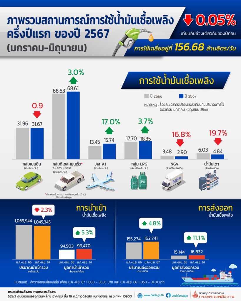 นายสราวุธ แก้วตาทิพย์ อธิบดีกรมธุรกิจพลังงาน เผยภาพรวมการใช้น้ำมันเชื้อเพลิงรอบครึ่งปีแรกของปี 2567 เฉลี่ยเดือนมกราคม – มิถุนายน อยู่ที่ 156.68 ล้านลิตร/วัน ลดลงเมื่อเทียบกับช่วงเดียวกันของปีก่อน ร้อยละ 0.05 โดยน้ำมันเตามีการใช้ลดลงร้อยละ 19.7 NGV ลดลงร้อยละ 16.8 และน้ำมันกลุ่มเบนซินลดลงร้อยละ 0.9 ขณะที่การใช้น้ำมันอากาศยานเชิงพาณิชย์ (Jet A1) เพิ่มขึ้นร้อยละ 17.0 LPG เพิ่มขึ้นร้อยละ 3.7 และน้ำมันดีเซลหมุนเร็ว ณ สถานีบริการเพิ่มขึ้นร้อยละ 3.0