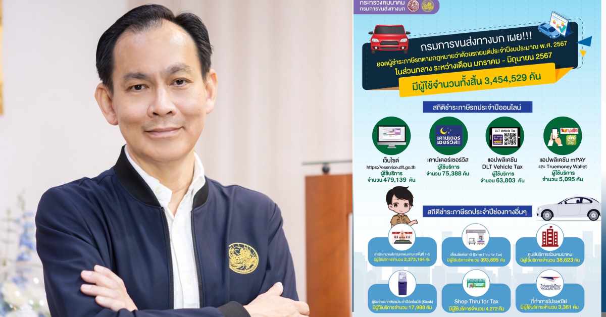นายเสกสม อัครพันธุ์ รองอธิบดีกรมการขนส่งทางบก และโฆษกกรมการขนส่งทางบก กล่าวว่า กรมการขนส่งทางบก มุ่งยกระดับการให้บริการการชำระภาษีรถยนต์และรถจักรยานยนต์ เพื่ออำนวยความสะดวกให้แก่ประชาชน และมีทางเลือกสำหรับการเข้าถึงระบบการชำระภาษีหลายช่องทาง ซึ่งการชำระภาษีออนไลน์ได้รับความนิยมจากประชาชนเพิ่มขึ้นเป็นอย่างมาก เนื่องจากเป็นช่องทางที่มีความสะดวกและไม่ต้องเดินทางมาที่สำนักงานขนส่ง อยู่ที่ไหนก็สามารถชำระภาษีได้ ณ ปัจจุบัน มีช่องทางการชำระภาษีออนไลน์หลากหลายช่องทาง เช่น การชำระภาษีออนไลน์ผ่านทางเว็บไซต์กรมการขนส่งทางบก https://eservice.dlt.go.th, แอปพลิเคชัน DLT Vehicle Tax, เคาน์เตอร์เซอร์วิส,แอปพลิเคชัน mPAY และ Truemoney Wallet สำหรับยอดผู้ชำระภาษีรถตามกฎหมายว่าด้วยรถยนต์ประจำปีงบประมาณ พ.ศ. 2567 ระหว่างวันที่ 1 ม.ค. 2567 – 30 มิ.ย. 2567 กรมการขนส่งทางบกสามารถจัดเก็บภาษีรถในส่วนกลาง (พื้นที่ 1 – 5) ได้จำนวนทั้งสิ้น 3,454,529 คัน รวมทั้งสิ้นเป็นเงิน 4,664,709,845.02 บาท โดยแบ่งออกเป็นผู้ใช้บริการชำระภาษีรถประจำปีออนไลน์ เว็บไซต์ https://eservice.dlt.go.th จำนวน 479,139 คันแอปพลิเคชัน DLT Vehicle Tax จำนวน 63,803 คัน ผ่านแอปพลิเคชัน mPAY และ Truemoney Wallet จำนวน 5,095 คัน และเคาน์เตอร์เซอร์วิส จำนวน 75,388 คัน ในส่วนการใช้บริการรับชำระภาษีรถประจำปี ณ สำนักงานขนส่งกรุงเทพมหานครพื้นที่ 1-5 มีผู้ใช้บริการจำนวน 2,373,164 คัน การใช้บริการเลื่อนล้อต่อภาษี (Drive Thru for Tax) จำนวน 393,695 คัน Shop Thru for Tax จำนวน 4,272 คัน ที่ทำการไปรษณีย์ จำนวน 3,361 คัน ชำระผ่านศูนย์บริการร่วมคมนาคม จำนวน 38,623 คัน ตู้ Kiosk จำนวน 17,988 คัน ผู้ที่ต้องการชำระภาษีรถประจำปีสามารถชำระล่วงหน้าได้ก่อนครบอายุภาษี 90 วัน อีกทั้งรถยนต์อายุการใช้งานเกิน 7 ปี รถจักรยานยนต์ อายุการใช้งานเกิน 5 ปี รวมถึงรถที่ค้างชำระภาษีเกิน 1 ปี แต่ไม่เกิน 3 ปี สามารถนำรถเข้าตรวจสภาพ ณ สถานตรวจสภาพรถเอกชน ก่อนชำระภาษีล่วงหน้าผ่านระบบออนไลน์