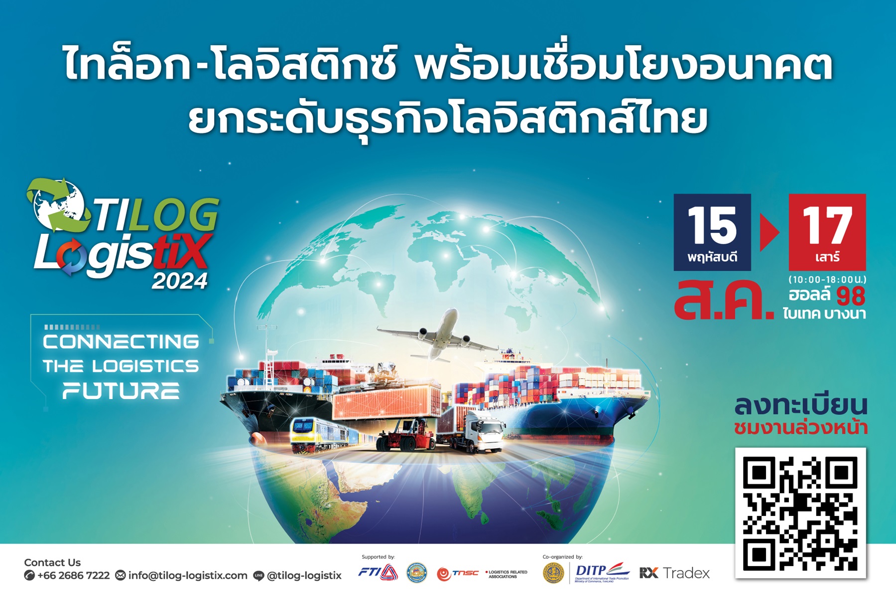 กรมส่งเสริมการค้าระหว่างประเทศ กระทรวงพาณิชย์ (DITP) ร่วมกับ อาร์เอ็กซ์ เทรดเด็กซ์ (RX Tradex) กำหนดจัดงาน TILOG – LOGISTIX 2024 ระหว่างวันที่ 15 – 17 สิงหาคมนี้ ที่ไบเทค ฮอลล์ 98 พร้อมดึงผู้ประกอบการกว่า 150 บริษัท นำเสนอสินค้าและบริการกว่า 415 แบรนด์จาก 25 ประเทศ เข้าจัดแสดงนวัตกรรม เทคโนโลยีและบริการด้านโลจิสติกส์ พร้อมกิจกรรมเสริมองค์ความรู้ สัมมนาวิชาการ คาดผู้เข้าชมงาน 9,000 ราย
