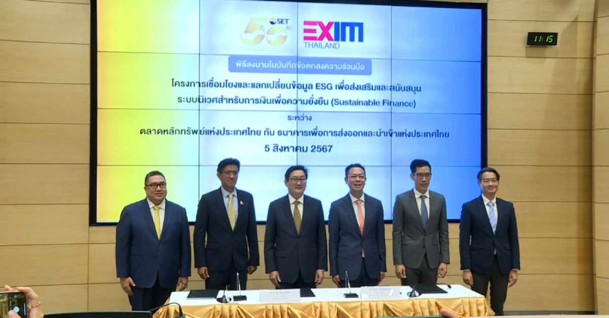 ดร.ภากร ปีตธวัชชัย กรรมการและผู้จัดการ ตลาดหลักทรัพย์แห่งประเทศไทย (ตลท.) เปิดเผยว่า ตลาดหลักทรัพย์ฯ เล็งเห็นถึงความต้องการข้อมูลด้าน ESG ที่เติบโตอย่างต่อเนื่อง ทั้งในกลุ่มผู้ลงทุน และสถาบันการเงินที่นำข้อมูล ESG ไปใช้ประกอบการออกผลิตภัณฑ์ทางการเงินการลงทุนเพื่อวัตถุประสงค์ด้านการพัฒนาที่ยั่งยืน ตลาดหลักทรัพย์ฯ ได้เร่งพัฒนาเทคโนโลยีและแพลตฟอร์มรองรับข้อมูลESG ซึ่งปัจจุบันมีระบบจัดการข้อมูลด้าน ESG เช่นระบบ SET ESG Data Platform ที่ให้บริการข้อมูลตั้งแต่ปี 2566 โดยรวบรวมข้อมูลด้าน ESG ของ บจ. กว่า 700 บริษัท อีกทั้งพัฒนาระบบ SET Carbon ที่อยู่ระหว่างการทดลองใช้ระบบโดย บจ. นำร่องในปี 2567 และจะเปิดให้บริการอย่างเป็นทางการในปี 2568 ซึ่งจะช่วยให้ บจ. และบริษัทในห่วงโซ่อุปทานสามารถจัดทำและทวนสอบข้อมูลการปล่อยก๊าซเรือนกระจกได้อย่างมีประสิทธิภาพบนระบบงานเดียว นอกจากนี้ ตลาดหลักทรัพย์ฯ ยังเดินหน้าสร้างความร่วมมือกับหน่วยงานทั้งในและต่างประเทศเพื่อให้มีการแลกเปลี่ยนและนำข้อมูลไปใช้อย่างต่อเนื่อง โดยเฉพาะการใช้ข้อมูล ESG เพื่อการระดมทุนและการลงทุน ความร่วมมือกับ EXIM BANK ครั้งนี้ ตลาดหลักทรัพย์ฯ เชื่อมั่นว่าจะช่วยเพิ่มโอกาสให้ภาคธุรกิจเข้าถึงแหล่งเงินทุนและเครื่องมือทางการเงินมากยิ่งขึ้น ถือเป็นก้าวสำคัญของการพัฒนาระบบนิเวศทางการเงินที่ยั่งยืนของประเทศไทย