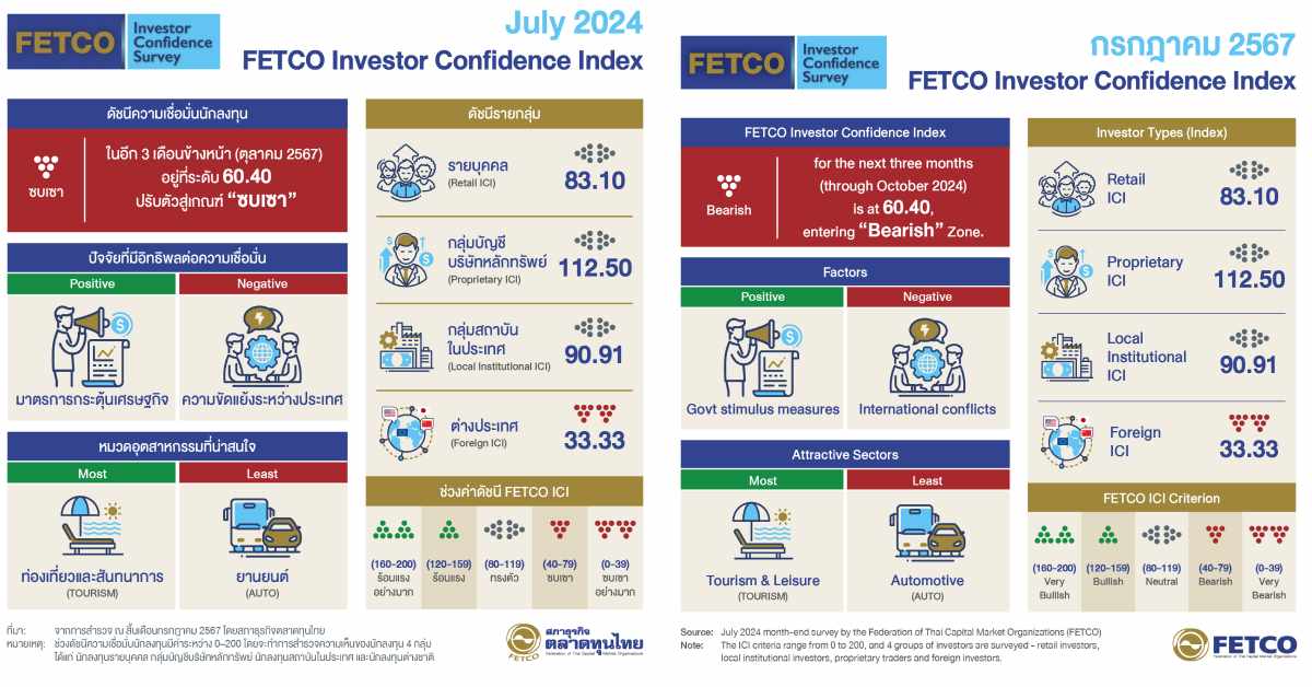 นายกอบศักดิ์ ภูตระกูล ประธานกรรมการสภาธุรกิจตลาดทุนไทย เปิดเผยดัชนีความเชื่อมั่นนักลงทุน (FETCO Investor Confidence Index) ผลสำรวจในเดือนสิงหาคม 2567 (สำรวจระหว่างวันที่ 20-31สิงหาคม 2567) พบว่าดัชนีความเชื่อมั่นนักลงทุน (FETCO Investor Confidence Index: ICI) ในอีก 3เดือนข้างหน้าอยู่ที่ระดับ 60.40 ปรับลงมาอยู่ในเกณฑ์ “ซบเซา” นักลงทุนมองว่ามาตรการกระตุ้นเศรษฐกิจของภาครัฐ เป็นปัจจัยหนุนความเชื่อมั่นมากที่สุด รองลงมาคือการฟื้นตัวของเศรษฐกิจในประเทศ และการฟื้นตัวของภาคการท่องเที่ยว ในขณะที่ปัจจัยที่ฉุดความเชื่อมั่นนักลงทุนมากที่สุด ได้แก่ สถานการณ์ความขัดแย้งระหว่างประเทศ รองลงมาคือนโยบายการเงินของ FED และการถดถอยของเศรษฐกิจในประเทศ