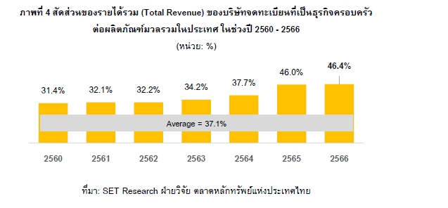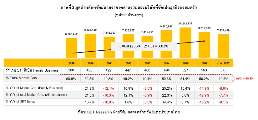 -ธุรกิจครอบครัวใช้กลไกตลาดหุ้นไทยในการระดมทุนเพื่อขยายกิจการอย่างต่อเนื่อง โดยพบว่า 76% ของบริษัทจดทะเบียนที่เข้าซื้อขายในช่วงปี 2559 ถึงสิ้นเดือนมิถุนายน 2567 เป็นธุรกิจครอบครัว