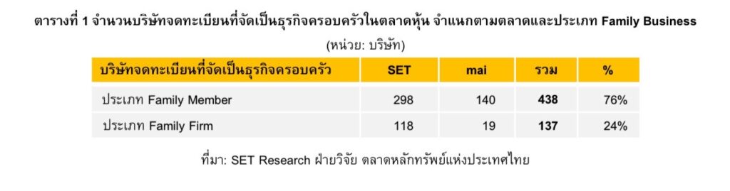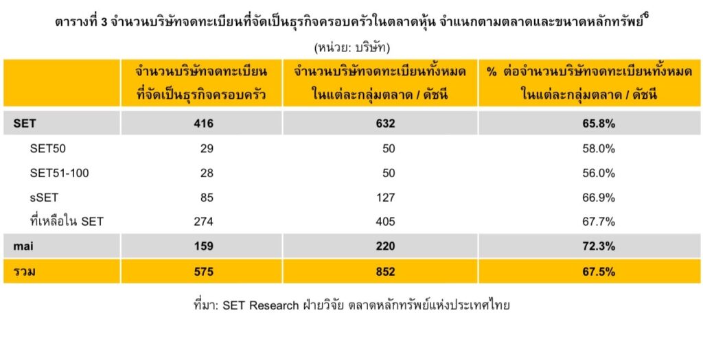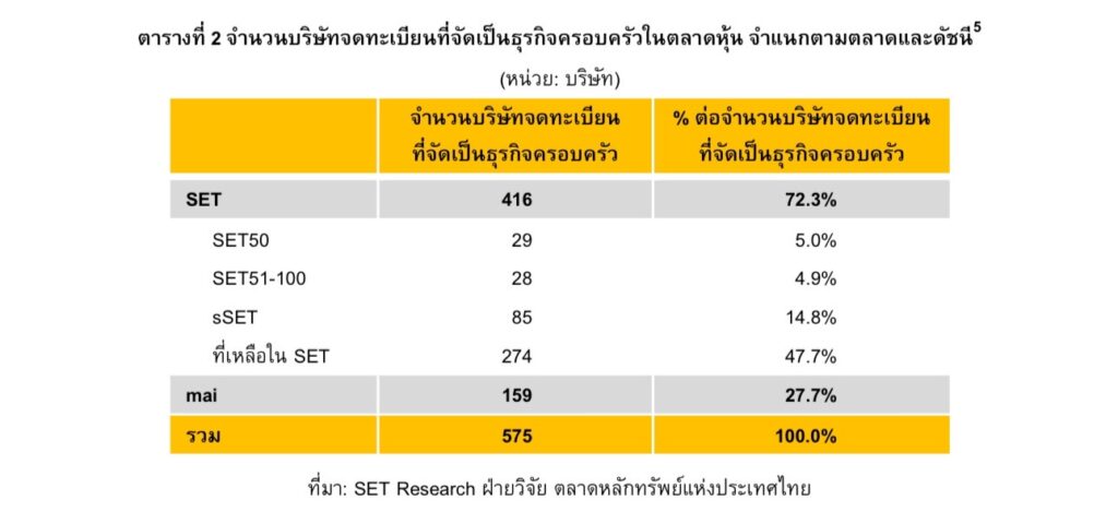 -575 บริษัท จาก 852 บริษัท หรือ 67% ของบริษัทจดทะเบียนในตลาดหุ้นไทยที่ทำการศึกษา จัดเป็น“ธุรกิจครอบครัว” ซึ่งบริษัทจดทะเบียนกลุ่มนี้มีมูลค่าหลักทรัพย์ตามราคาตลาดรวมคิดเป็น50% ของมูลค่าหลักทรัพย์ตามราคาตลาดรวมทั้งตลาด
