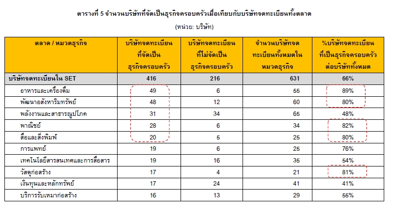 -บริษัทจดทะเบียนที่จัดเป็นธุรกิจครอบครัวกระจายตัวในเกือบทุกหมวดธุรกิจ ส่วนใหญ่อยู่ในหมวดอาหารและเครื่องดื่ม หมวดพัฒนาอสังหาริมทรัพย์ หมวดพลังงานและสาธารณูปโภค หมวดพาณิชย์ หมวดสื่อและสิ่งพิมพ์ และในตลาดหลักทรัพย์เอ็ม เอ ไอ (กลุ่มบริการ กลุ่มอสังหาริมทรัพย์และก่อสร้าง และกลุ่มสินค้าอุตสาหกรรม)