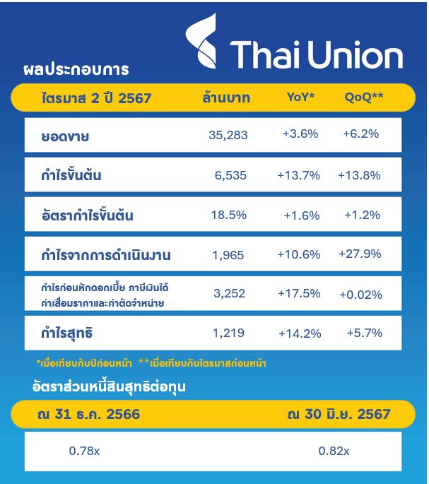 นายธีรพงศ์ จันศิริ ประธานเจ้าหน้าที่บริหาร บริษัท ไทยยูเนี่ยน กรุ๊ป กล่าวว่า ผลกำไรสุทธิในไตรมาสที่สองของปี 2567 จำนวน 1,219 ล้านบาท เพิ่มขึ้นร้อยละ 14.2 เมื่อเทียบกับไตรมาสเดียวกันของปีก่อน ได้รับแรงหนุนจากการฟื้นตัวต่อเนื่องของกลุ่มธุรกิจอาหารกระป๋อง อาหารสัตว์เลี้ยง และสินค้าเพิ่มมูลค่าและอื่น ๆ ขณะที่อัตราส่วนกำไรขั้นต้นปรับตัวขึ้นร้อยละ 18.5 เติบโตสูงสุดอันดับสองในรอบ 3 ปี ทำยอดขายได้ถึง 35,283 ล้านบาท เพิ่มขึ้น 3.6% เมื่อเทียบกับช่วงเดียวกันปีก่อน โดยเฉพาะการเติบโตของกลุ่มอาหารสัตว์เลี้ยงที่มียอดขายสูงถึงร้อยละ 40.6 เช่นเดียวกันกับอัตราส่วนกำไรขั้นต้นขยายตัวร้อยละ 31.3
