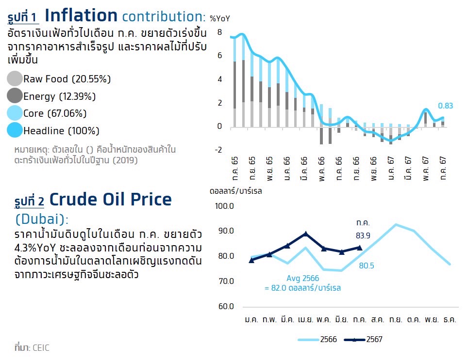 Krungthai COMPASS ธนาคารกรุงไทย เปิดเผยว่า จากตัวเลขอัตราเงินเฟ้อทั่วไปเดือน ก.ค.67 อยู่ที่ 0.83%YoY เติบโตในอัตราที่เพิ่มขึ้นเล็กน้อยจากเดือนก่อนที่ 0.62%YoY และสูงกว่าการคาดการณ์ของนักวิเคราะห์ที่ 0.7% โดยราคาหมวดอาหารสดขยายตัว 1.10%YoY จากเดือนก่อนที่ 0.19%YoY ตามราคาผลไม้สดที่ปรับเพิ่มขึ้น ประกอบกับราคาข้าวสารเจ้า ข้าวสารเหนียวที่ขยายตัว ขณะที่ราคาหมวดพลังงานขยายตัว 1.78%YoY ตามราคาน้ำมันเบนซินและแก๊สโซฮอล์ ด้านอัตราเงินเฟ้อพื้นฐานปรับเพิ่มขึ้นสู่ระดับ 0.52%YoY จากเดือนก่อนที่ 0.36%YoY ตามการเพิ่มขึ้นของราคาอาหารสำเร็จรูปเป็นสำคัญ อย่างไรก็ตาม มีราคาสินค้าบางรายการหดตัว ได้แก่ ของใช้ส่วนบุคคลซึ่งปรับลดลงตามการส่งเสริมการตลาดของผู้ประกอบการ และราคาหมวดเครื่องนุ่งห่มและรองเท้าที่หดตัวต่อเนื่อง ทั้งนี้ อัตราเงินเฟ้อทั่วไป 7 เดือนแรกของปีอยู่ที่ 0.11%YoY ขณะที่อัตราเงินเฟ้อพื้นฐานอยู่ที่ 0.42%YoY