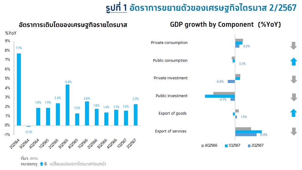 สำนักงานสภาพัฒนาการเศรษฐกิจและสังคมแห่งชาติ (สศช.) รายงานตัวเลขการเติบโตทางเศรษฐกิจในไตรมาสที่ 2/2567 เติบโต 2.3%YoY หรือขยายตัวเมื่อเทียบจากไตรมาสก่อน 0.8%QoQSA สูงกว่าการคาดการณ์ของนักวิเคราะห์ซึ่งประเมินไว้ที่ 2.1%YoY โดยในช่วงครึ่งปีแรกจีดีพีขยายตัวได้ 1.9%YoY ทั้งนี้สภาพัฒน์ปรับช่วงประมาณการอัตราการขยายตัวของจีดีพีปี 2567 เป็นช่วง 2.3-2.8% (ค่ากลางที่ 2.5%) จากเดิมในช่วง 2.0-3.0% เมื่อเดือน พ.ค. 2567