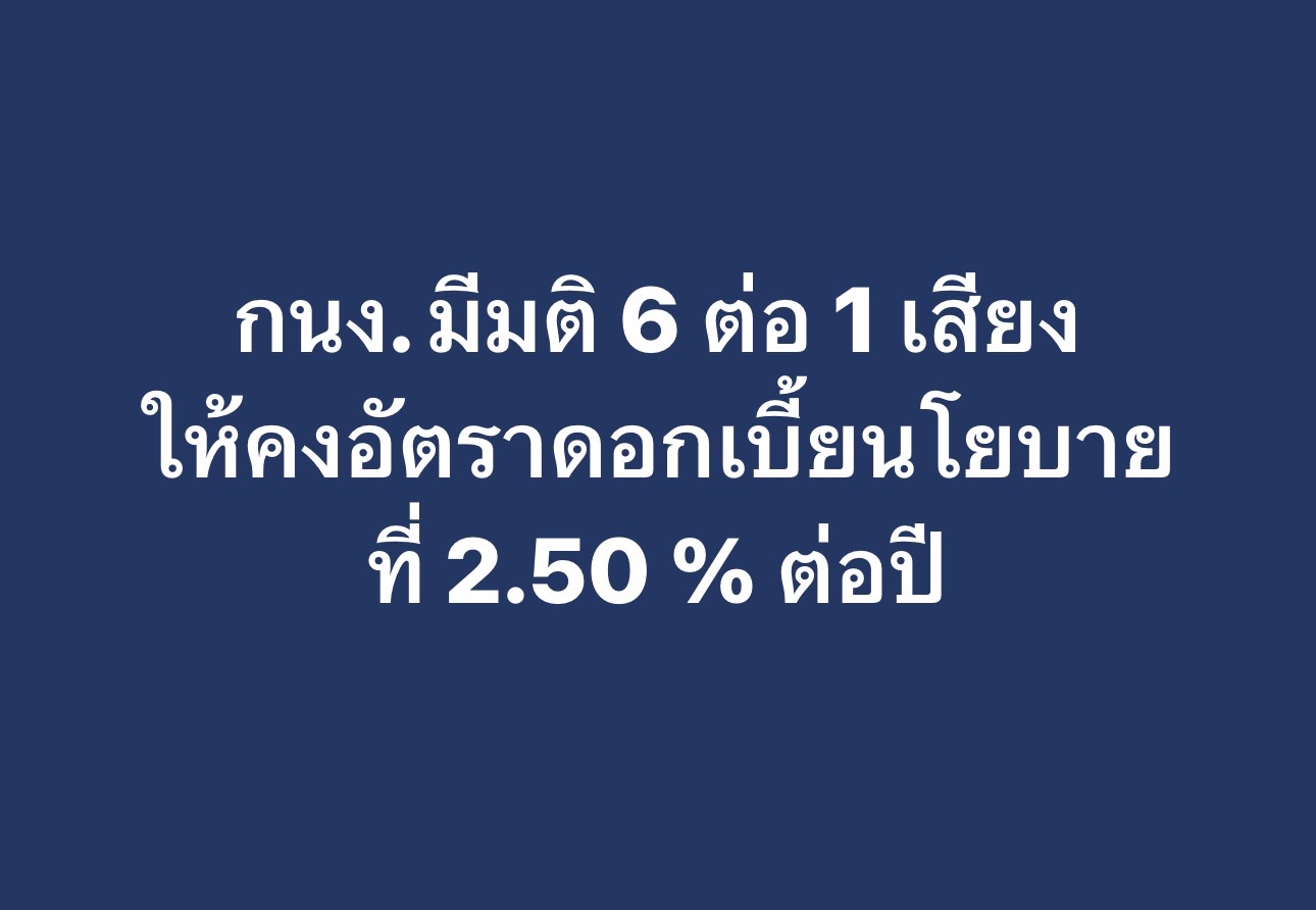 กรุงเทพฯ 21 ส.ค. – กนง. มีมติ 6 ต่อ 1 เสียง ให้คงอัตราดอกเบี้ยนโยบายที่ร้อยละ 2.50 ต่อปี โดย 1 เสียง เห็นควรให้ลดอัตราดอกเบี้ยนโยบายร้อยละ 0.25 ต่อปี