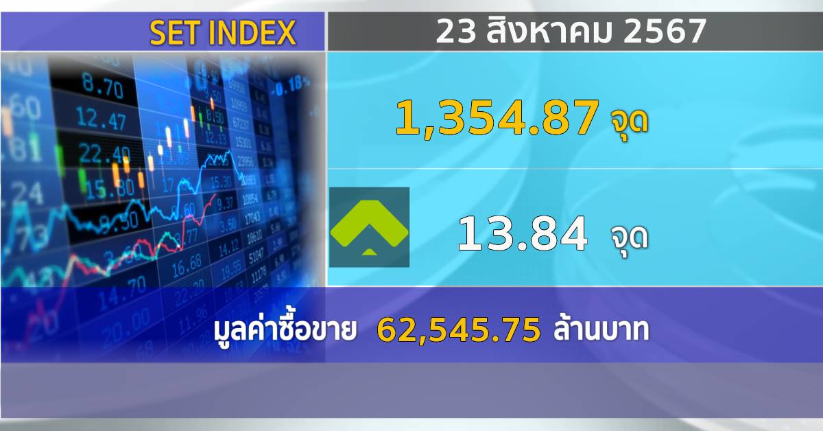 กทม. 23 ส.ค.- SET ปิดวันนี้ที่ 1,354.87 จุด เพิ่มขึ้น 13.84 จุด (+1.03%) มูลค่าซื้อขาย 62,545.75 ล้านบาท